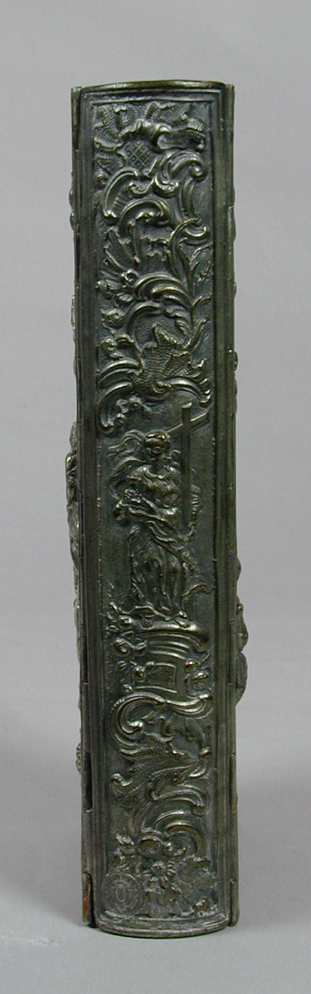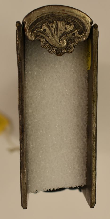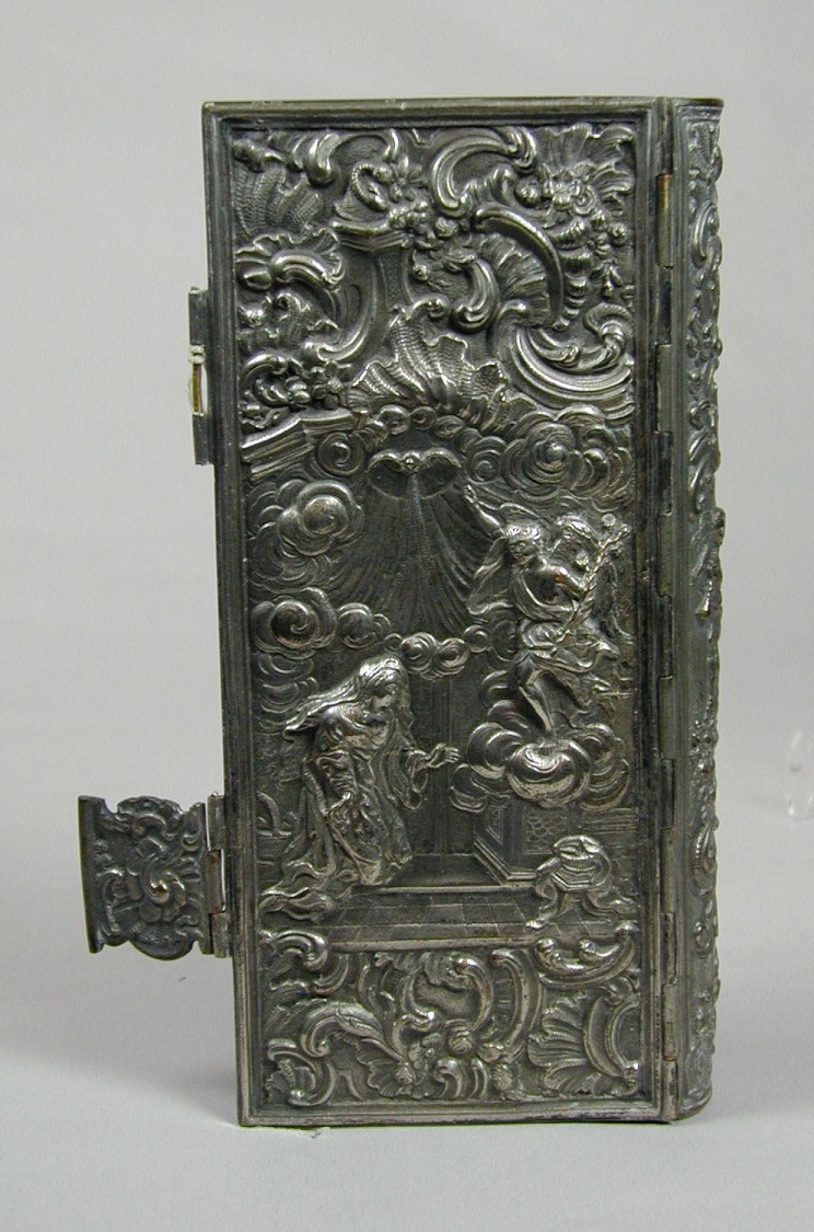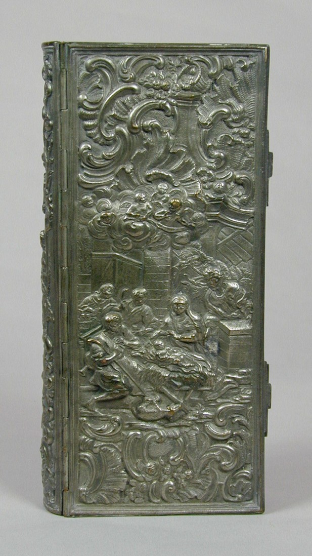 Een verzilverde koperen boekband, met voorop de aanbidding der herders, achterop annunciatie