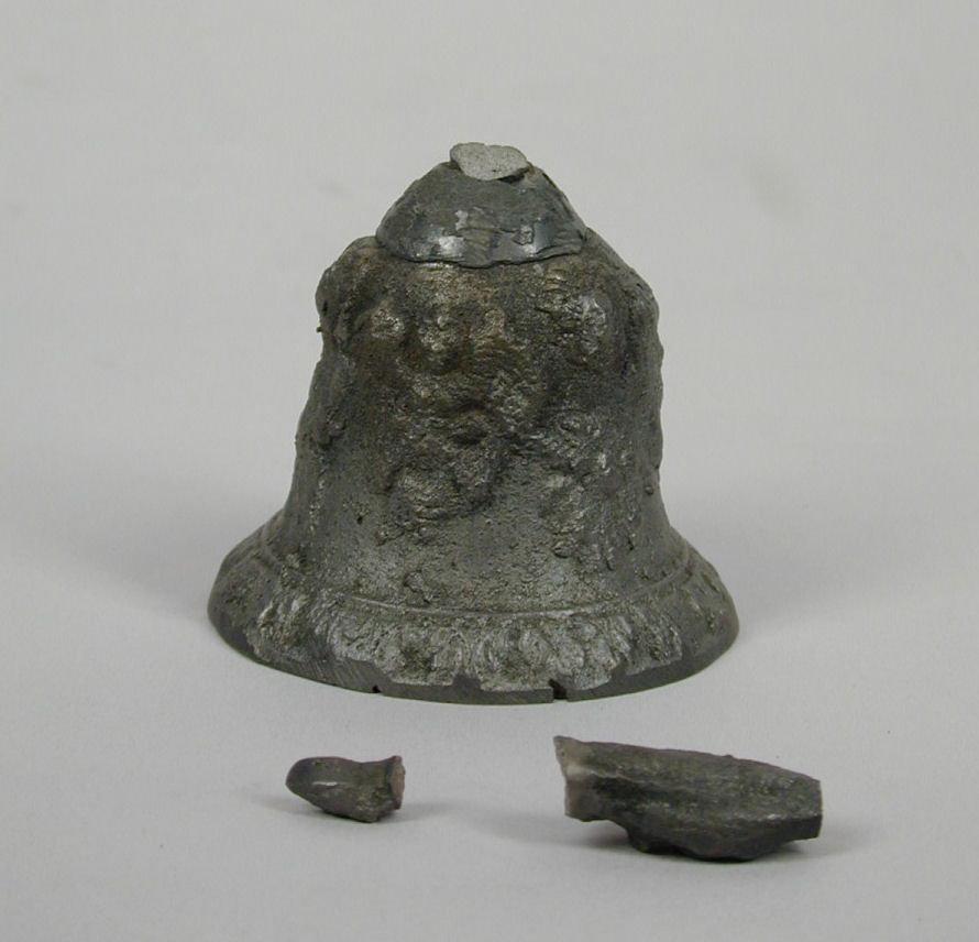Altaarbel met drie vage afbeeldingen van engelen, met bisschopsbeeldje als handvat