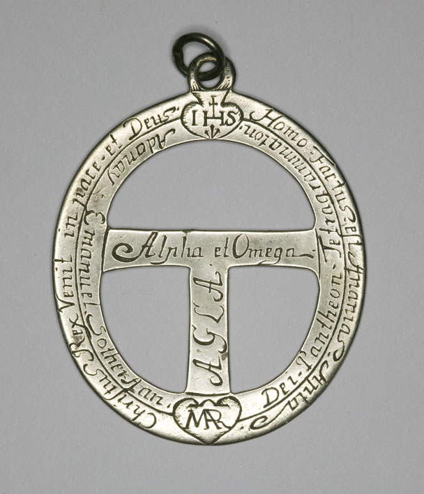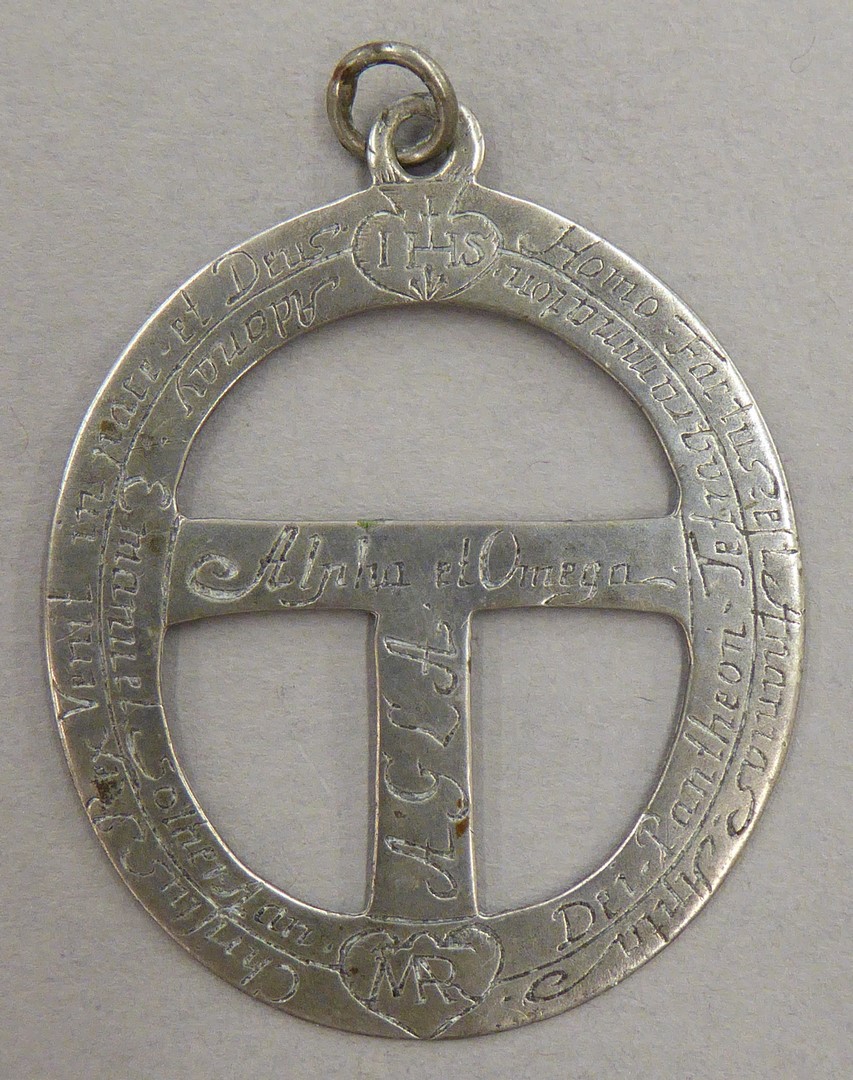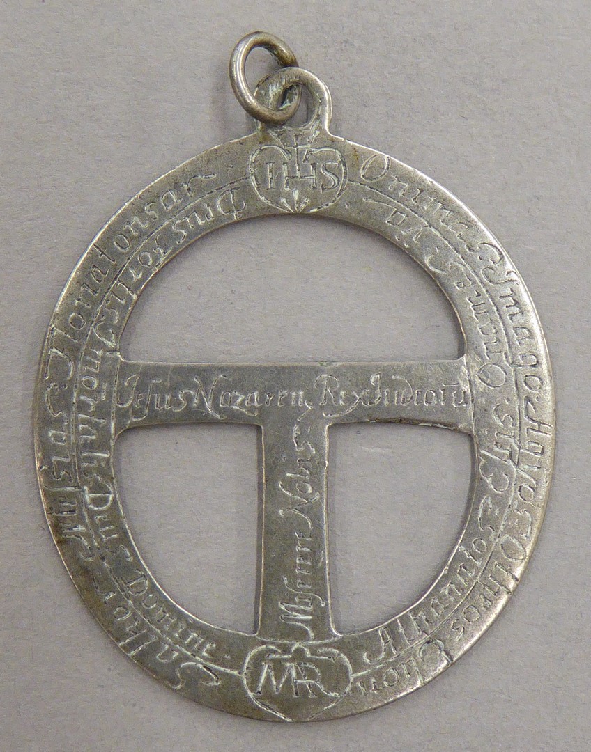 Draagteken, ovaal, als gesp uitgesneden met exorcismen-formules