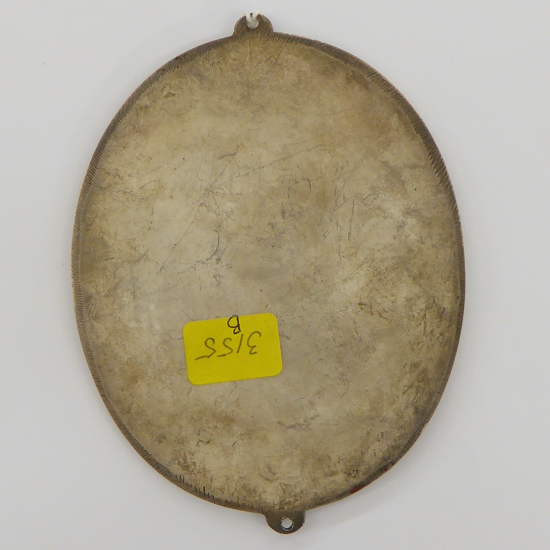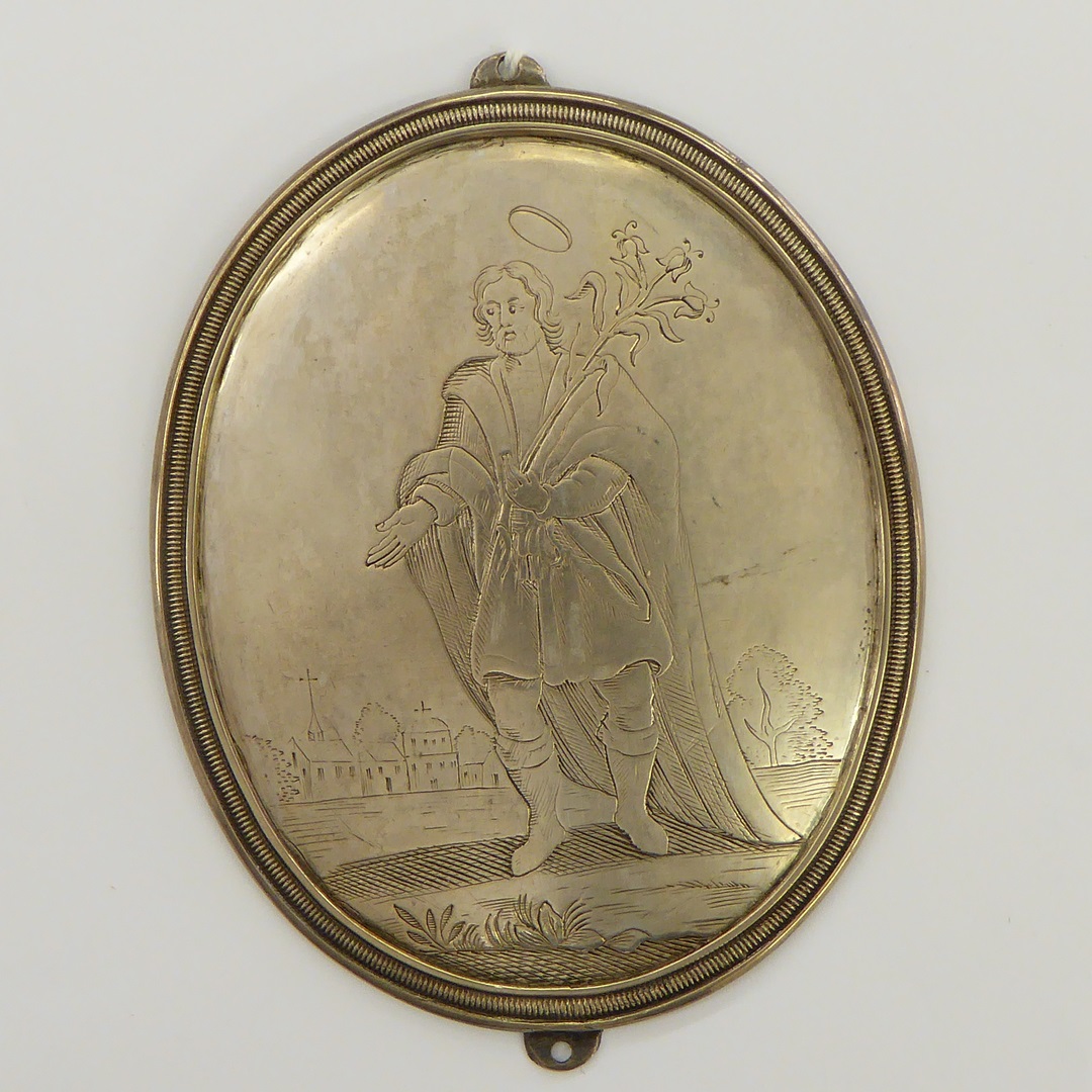 Plaquette, ovaal, met bisschop met pateen en hostie, met liggende man op de grond