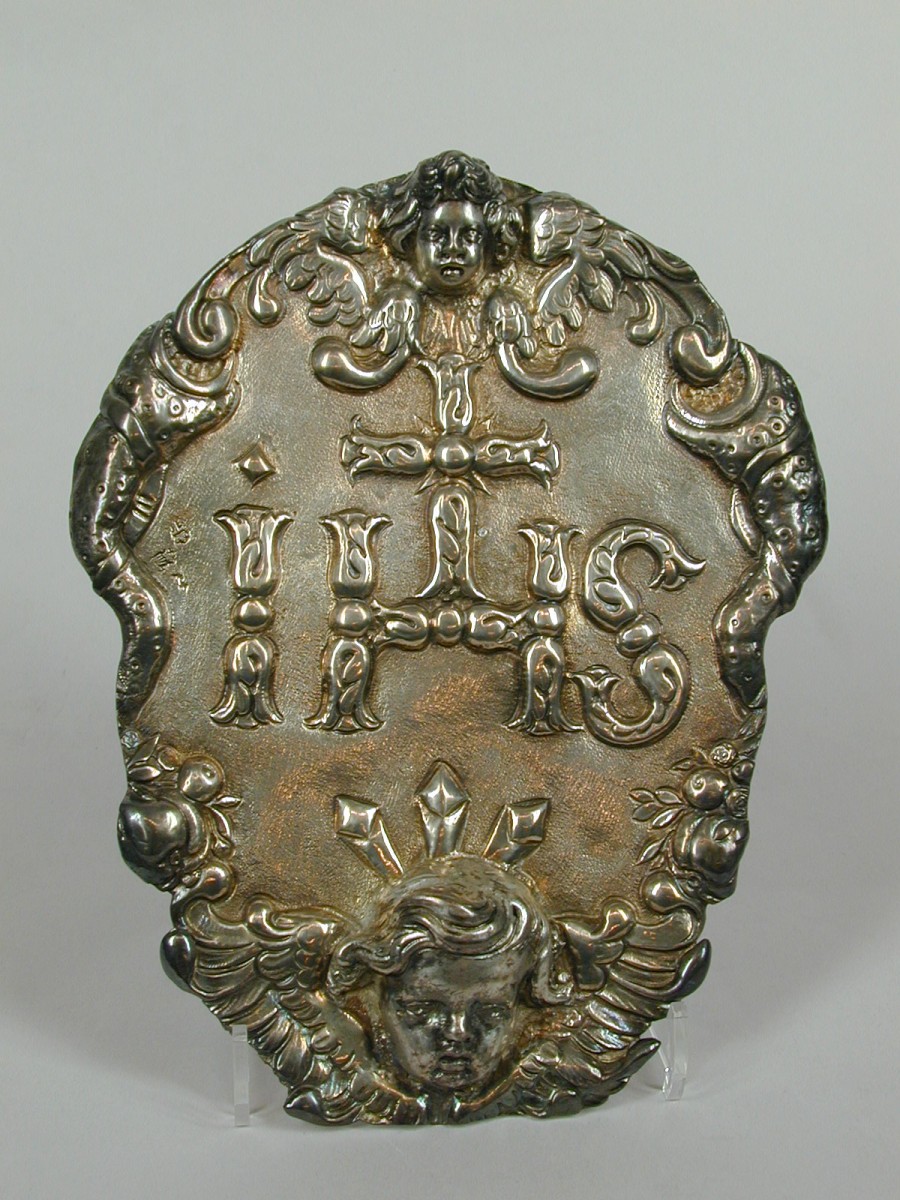 Plaquette, ovaal, met engelenkopjes, hoornen des overvloeds en monogram IHS