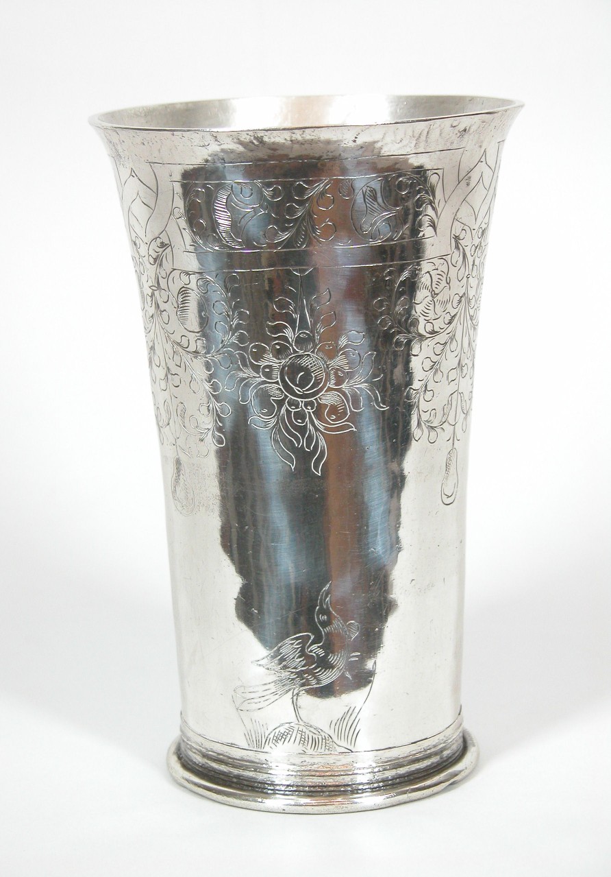Avondmaalsbeker, cylindrisch met uitwijdende rand, gegraveerd met vruchtmotieven en vogels