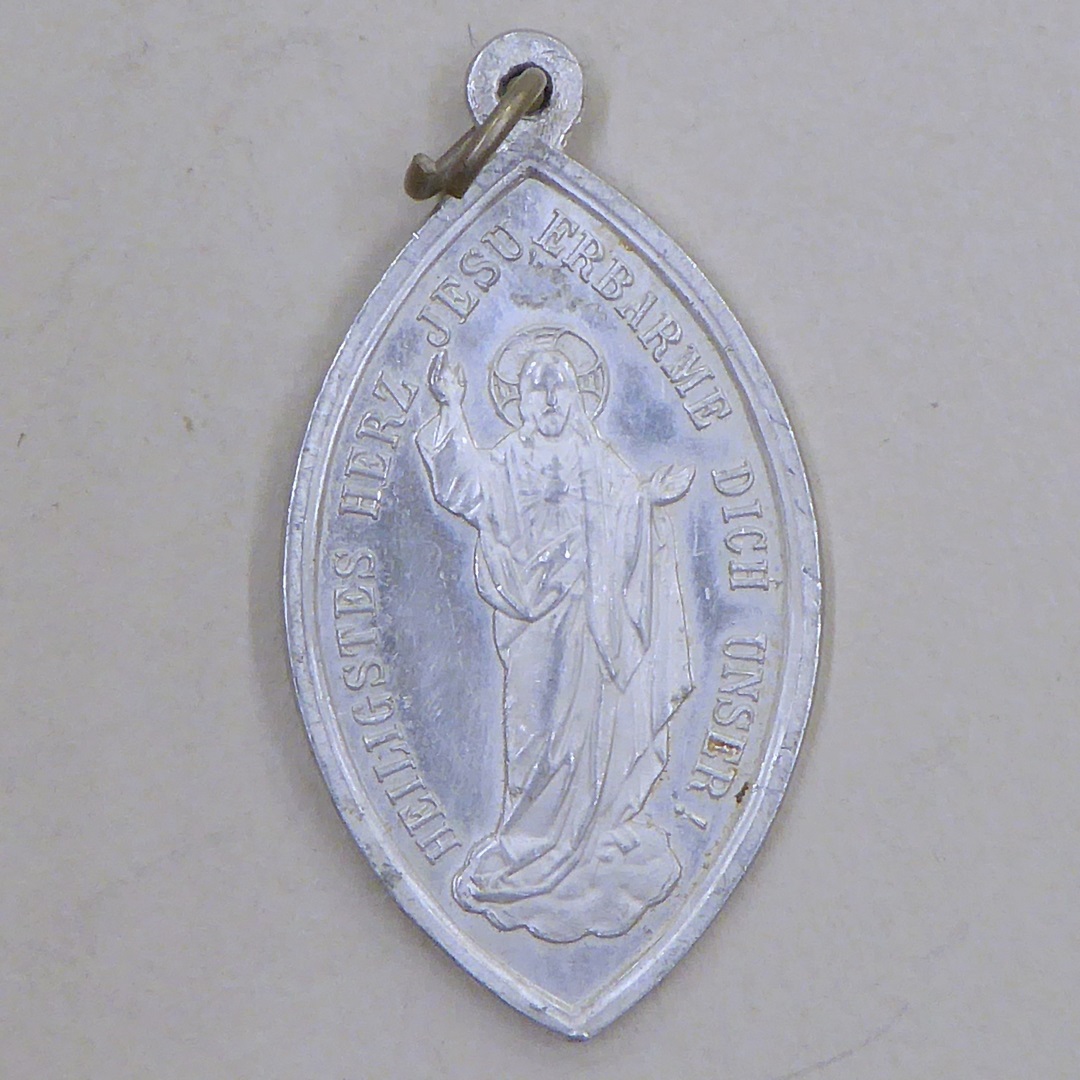Draagpenning, amandelvormig, met Christus met H. Hart, kz. Maria met kind
