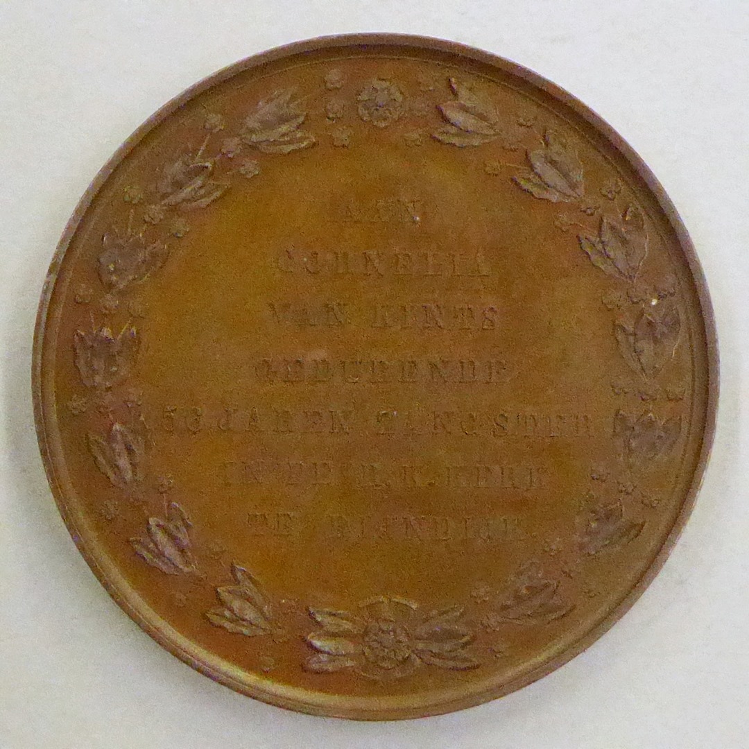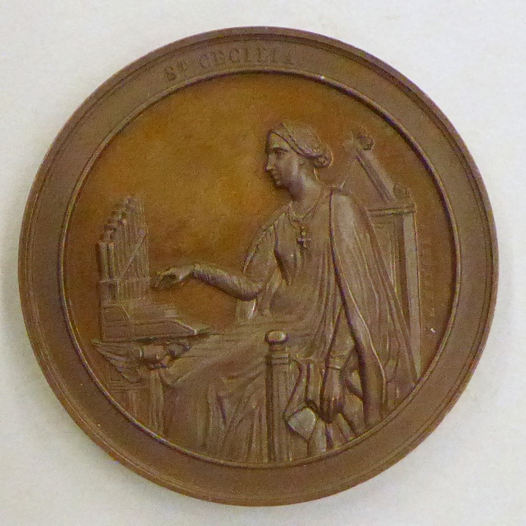 Gedenkpenning Cornelia van Kints 56 jaar zangster kerk Rijndijk, met St. Cecilia aan orgel, kz. tekst