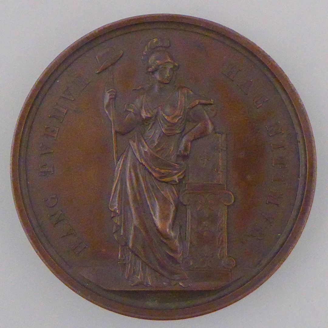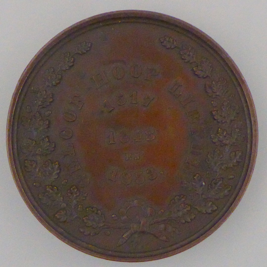 Herdenkingspenning Aprilbeweging 1853 met Nederlandse maagd met staf, kz. bladerkrans met "geloof hoop liefde 1517 1648 1953"