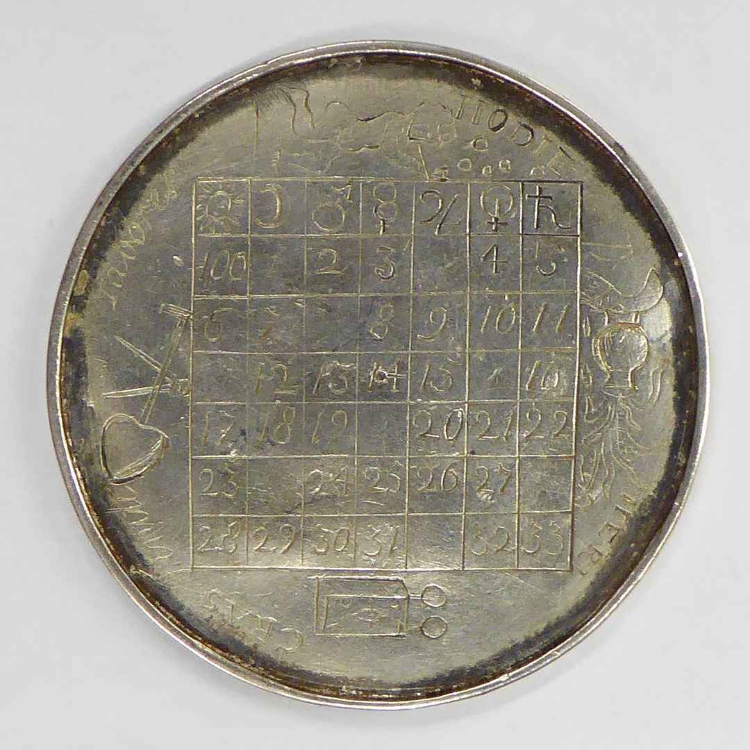 Penning met ingegraveerde cijfers in hokjes (kalender), "Hodie ...", kz. idem met "Quam brevia"