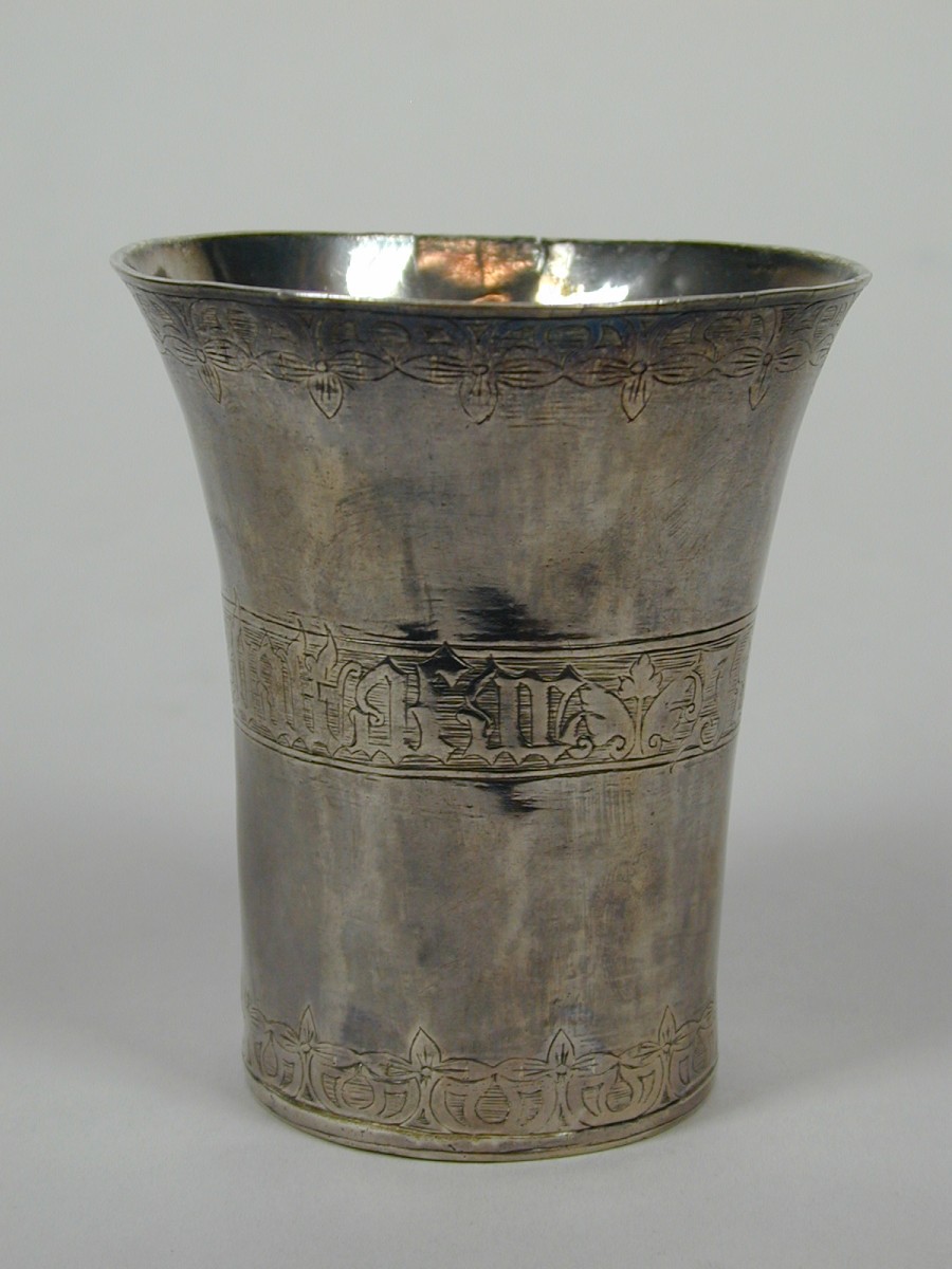 Driekoningenbekertje met "Caspar, Melchior, Baltasar", rand met gegraveerde lelies