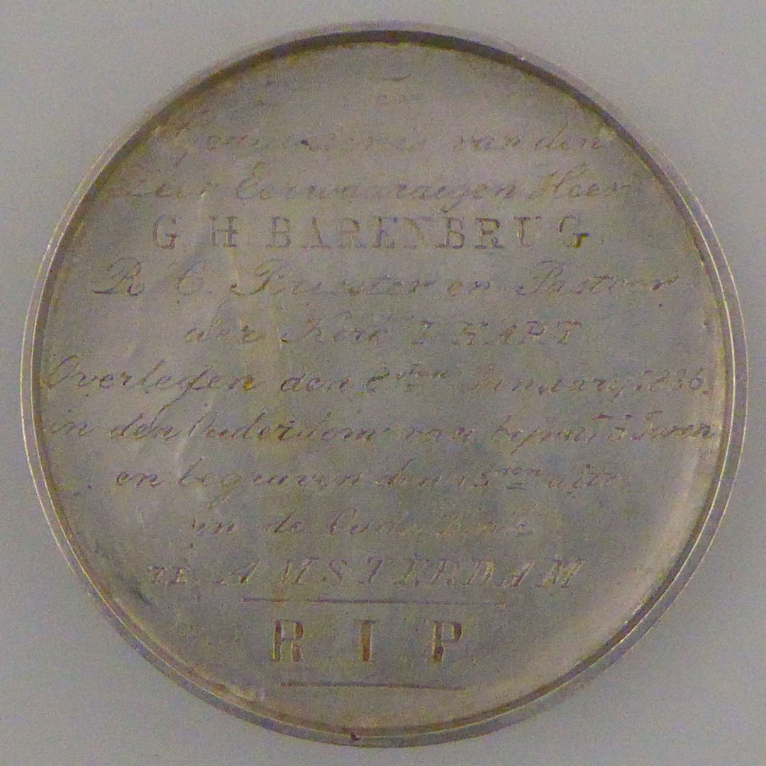 Begrafenispenning G.H. Barenbrug (+1836), pastoor 't Hartkerk te Amsterdam, kz. grafmonument