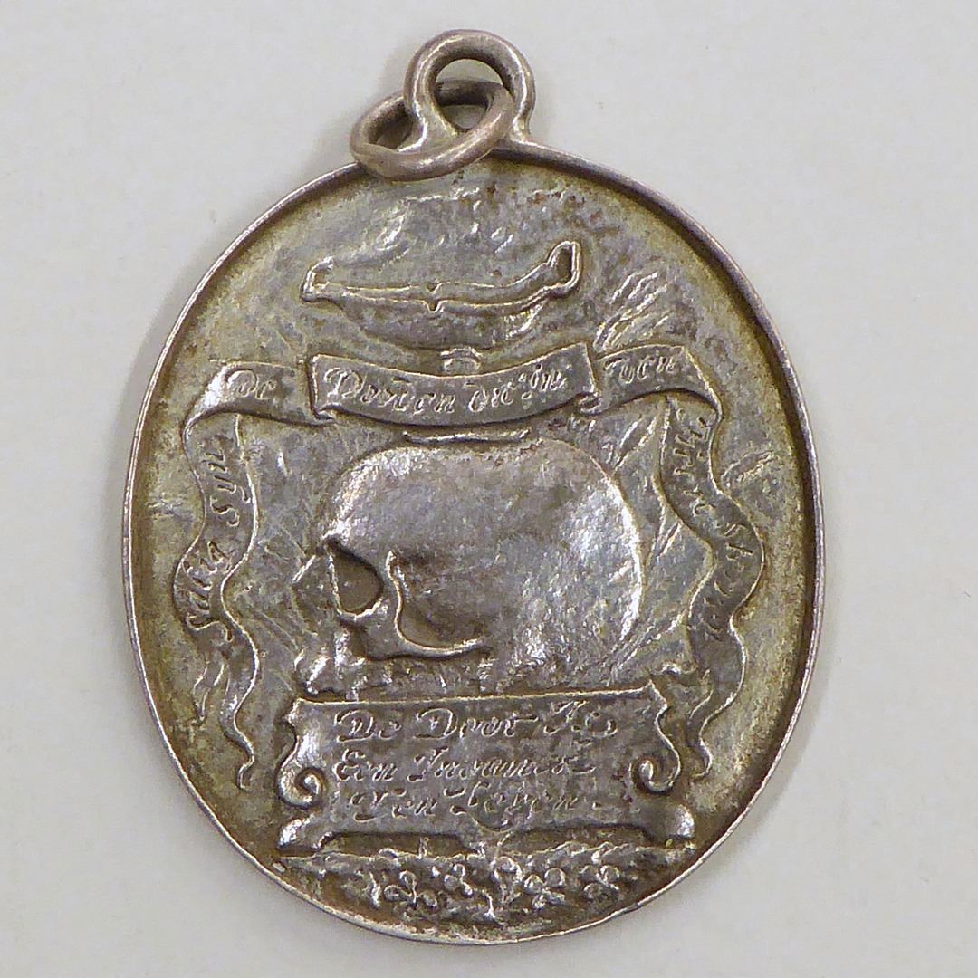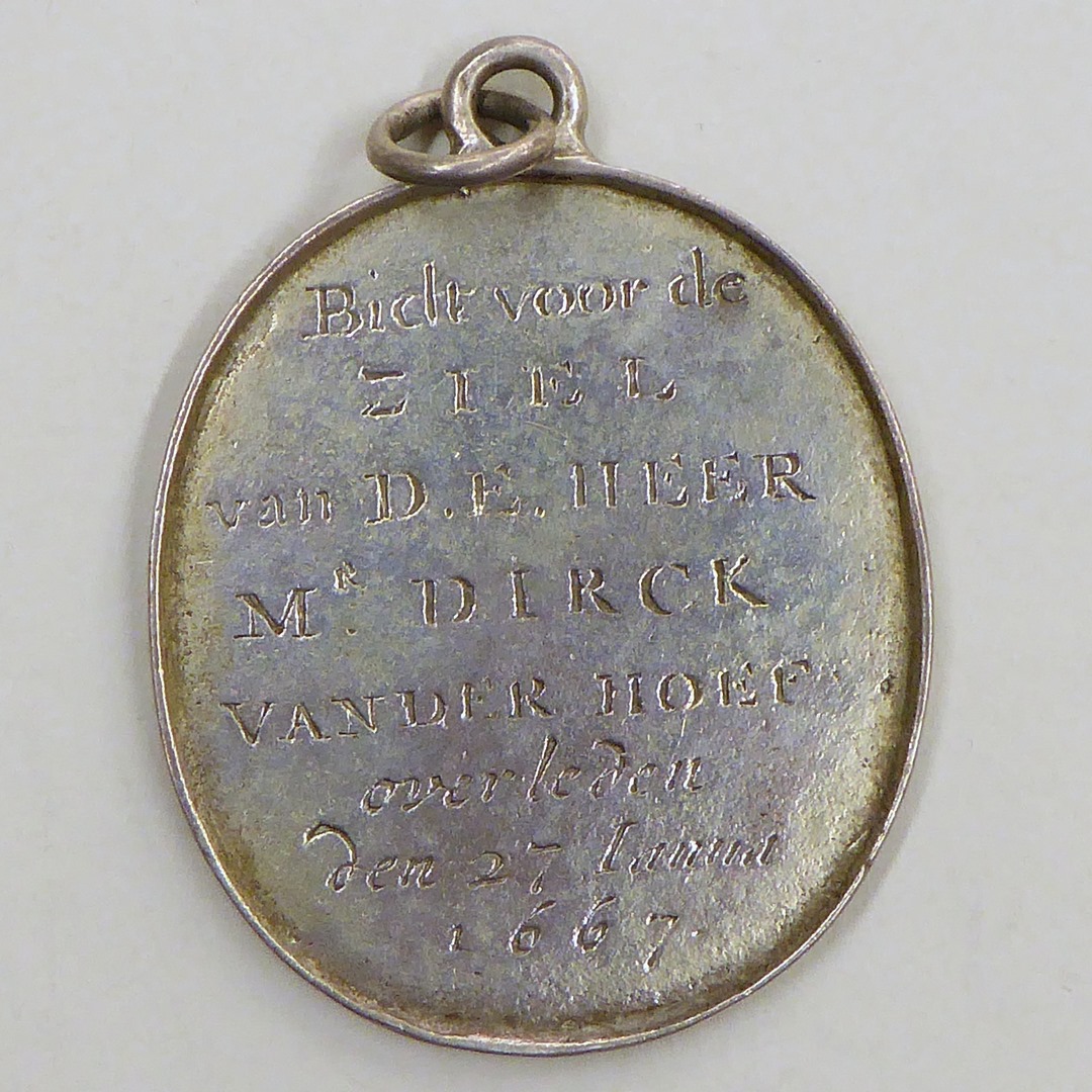 Begrafenispenning Mr. Dirck van der Hoef, overleden 1667, kz. met "Bidt voor de ziel ..."
