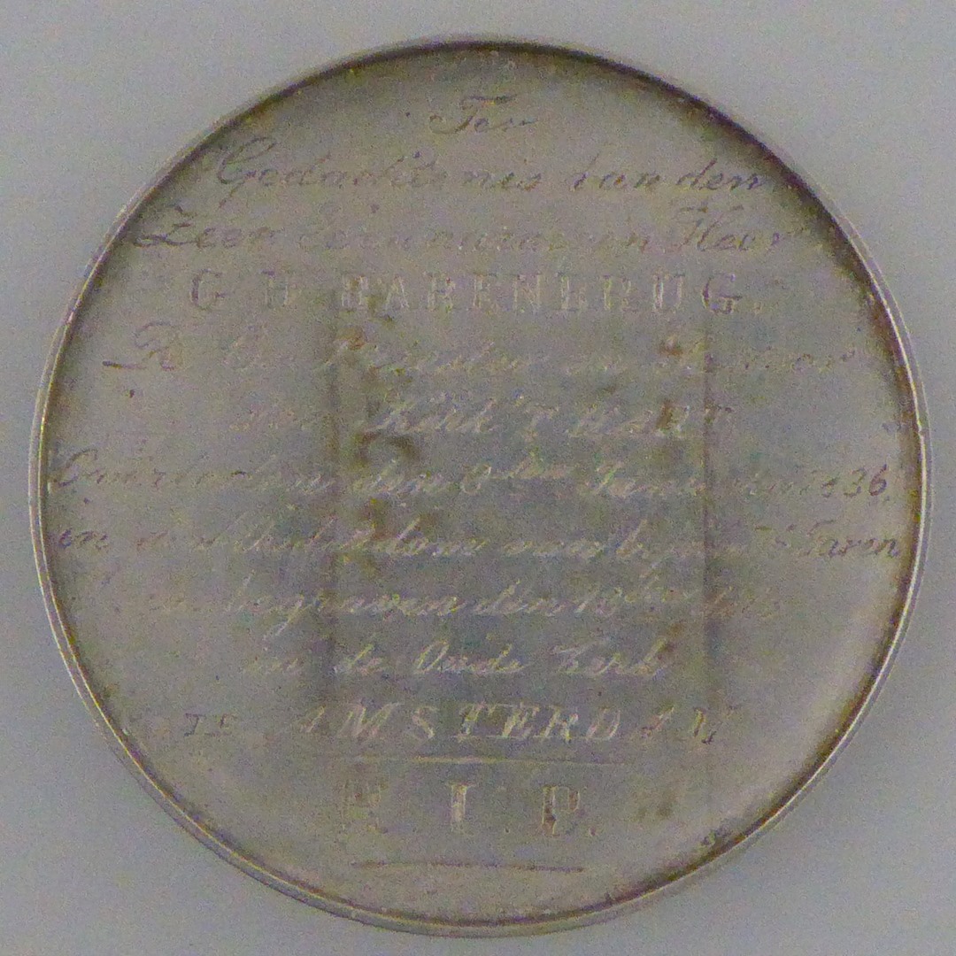 Begrafenispenning G.H. Barenbrug (+1836), pastoor 't Hartkerk Amsterdam, kz. grafmonument