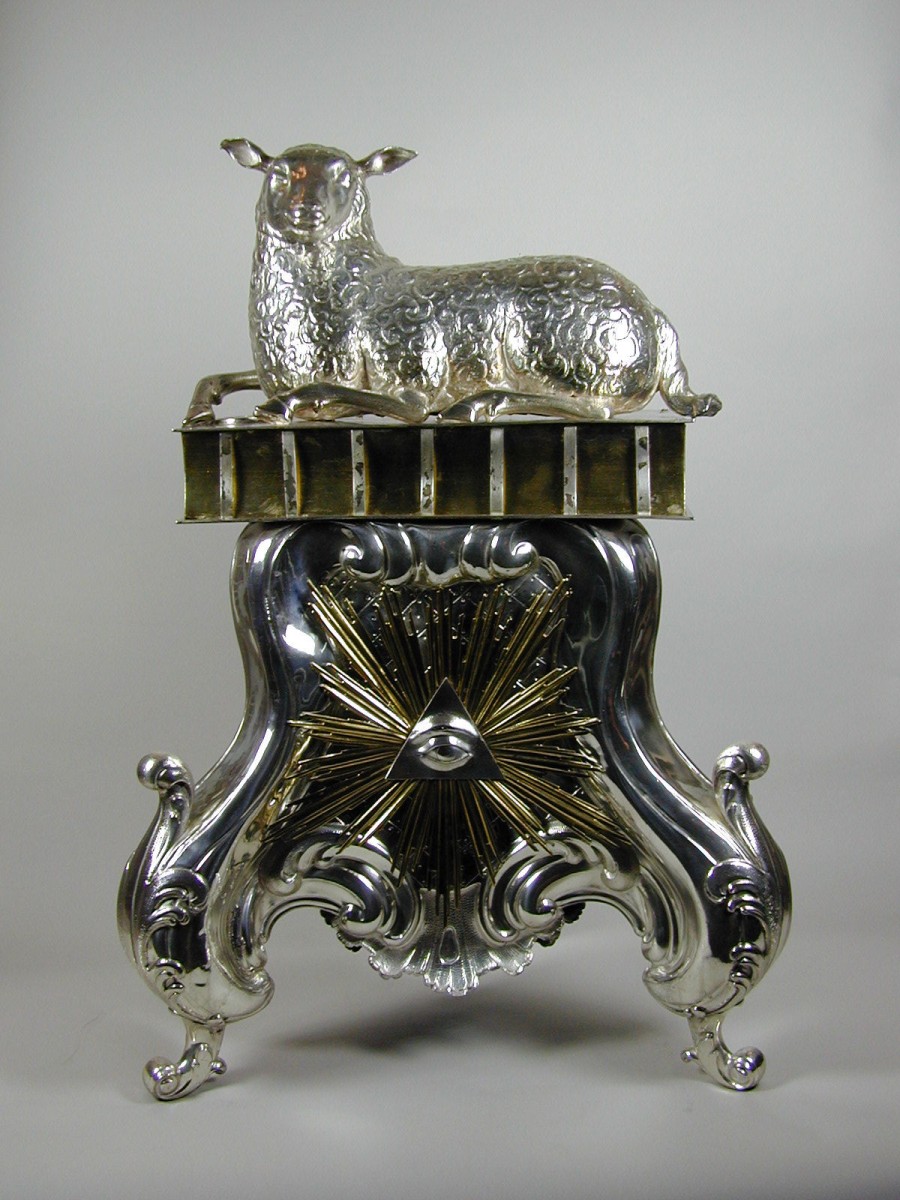 Standaard voor vaandel op driepoot, met alziend oog, liggend boek waarop liggend lam
