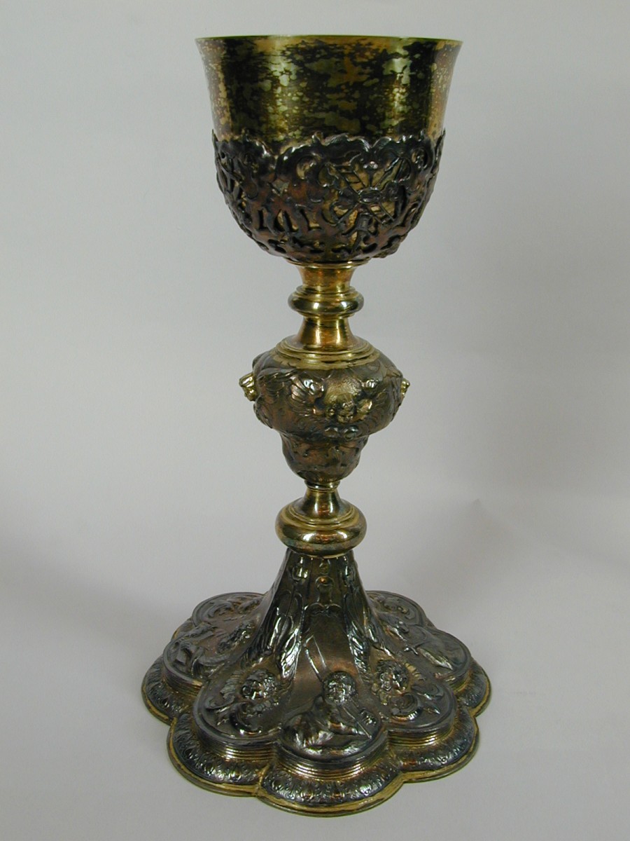 Kelk op achtlobbige voet met op welvend gedeelte Christus, Maria, Adelbertus en Lucas