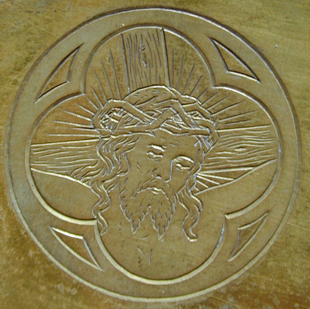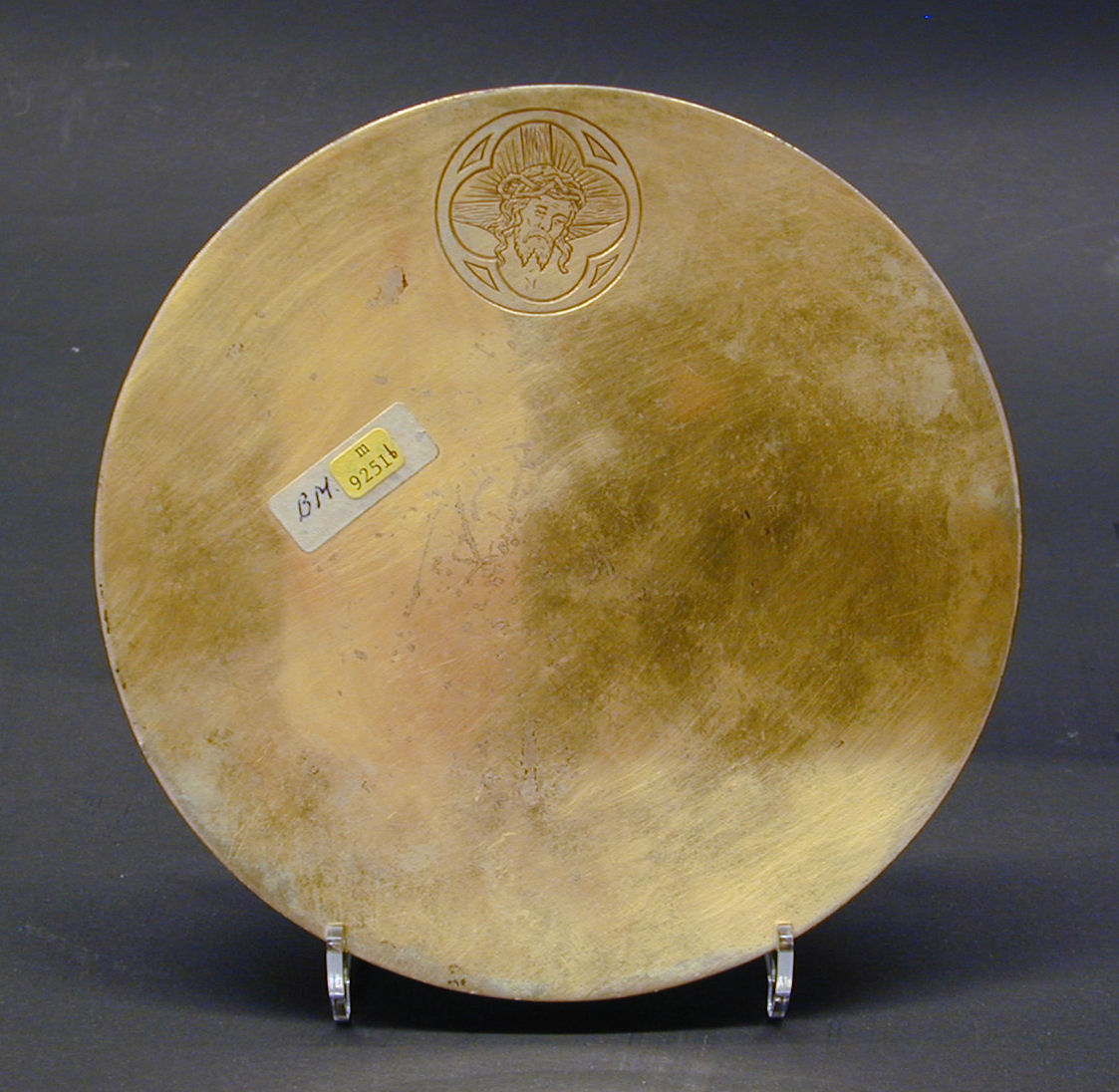 Pateen, neogotisch, met hoofd van Christus, achterzijde met Lam Gods en evangelistensymbolen