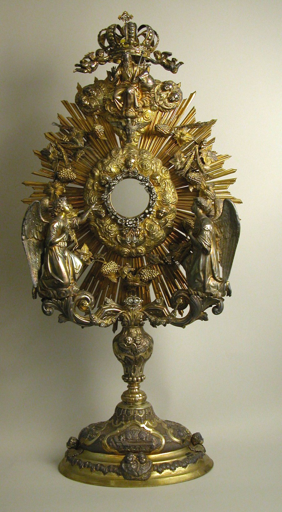 Monstrans, ovale voet, met twee engelen, rondom lunulahouder wolken waarin zeven engelenkopjes