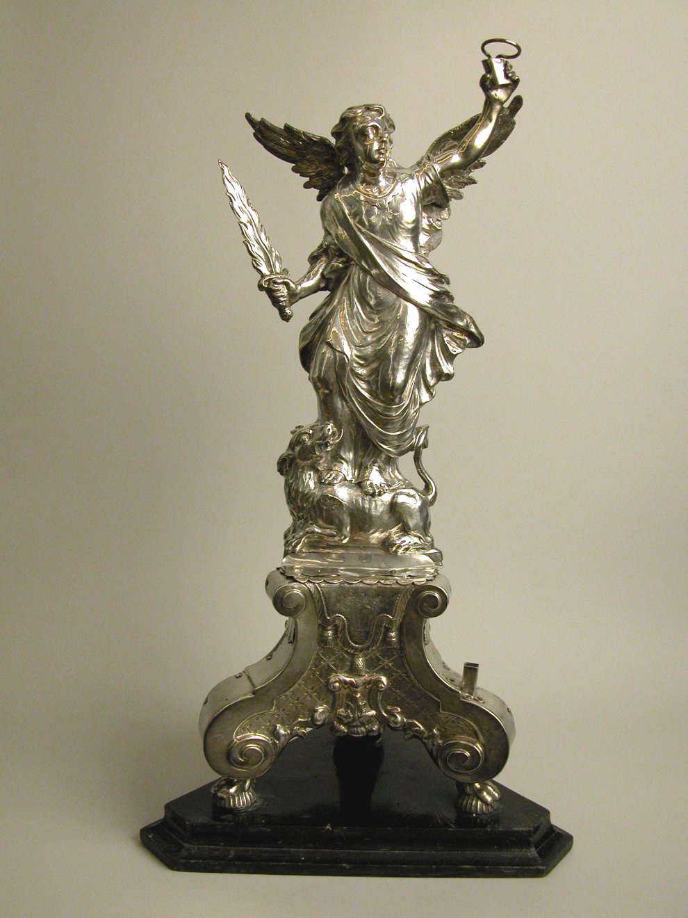 Standaard(?) voor expositievaantje, engel Michael staande op briesende draak