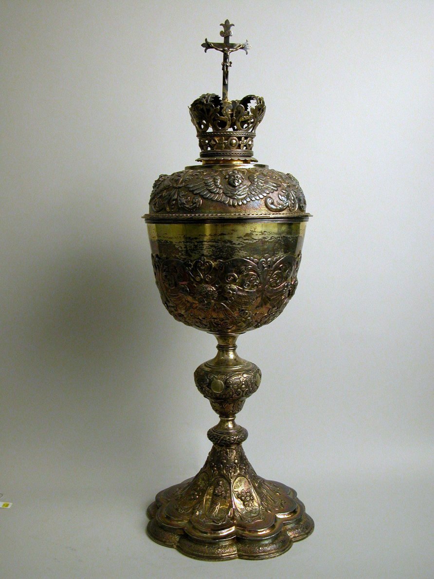 Ciborie op achtlobbige voet, met in vier ovalen Dominicus, Thomas van Aquino, Johannes, Catharina
