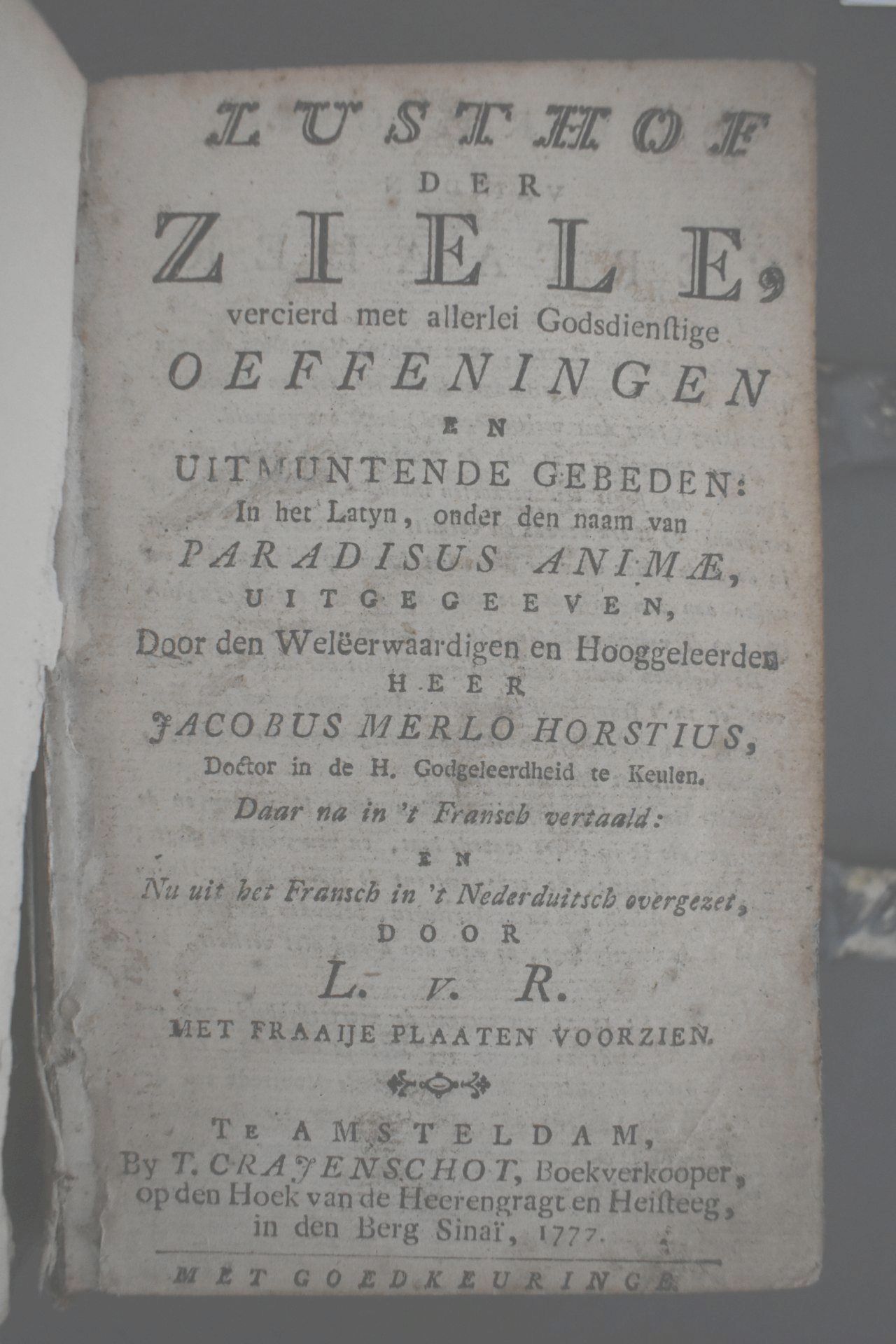 Lusthof der ziele, vercierd met allerlei godsdienstige oeffeningen en uitmuntende gebeden: in het Latyn [...] Paradisus animae [...] in 't Nederduitsch overgezet door L. v. R. [...]