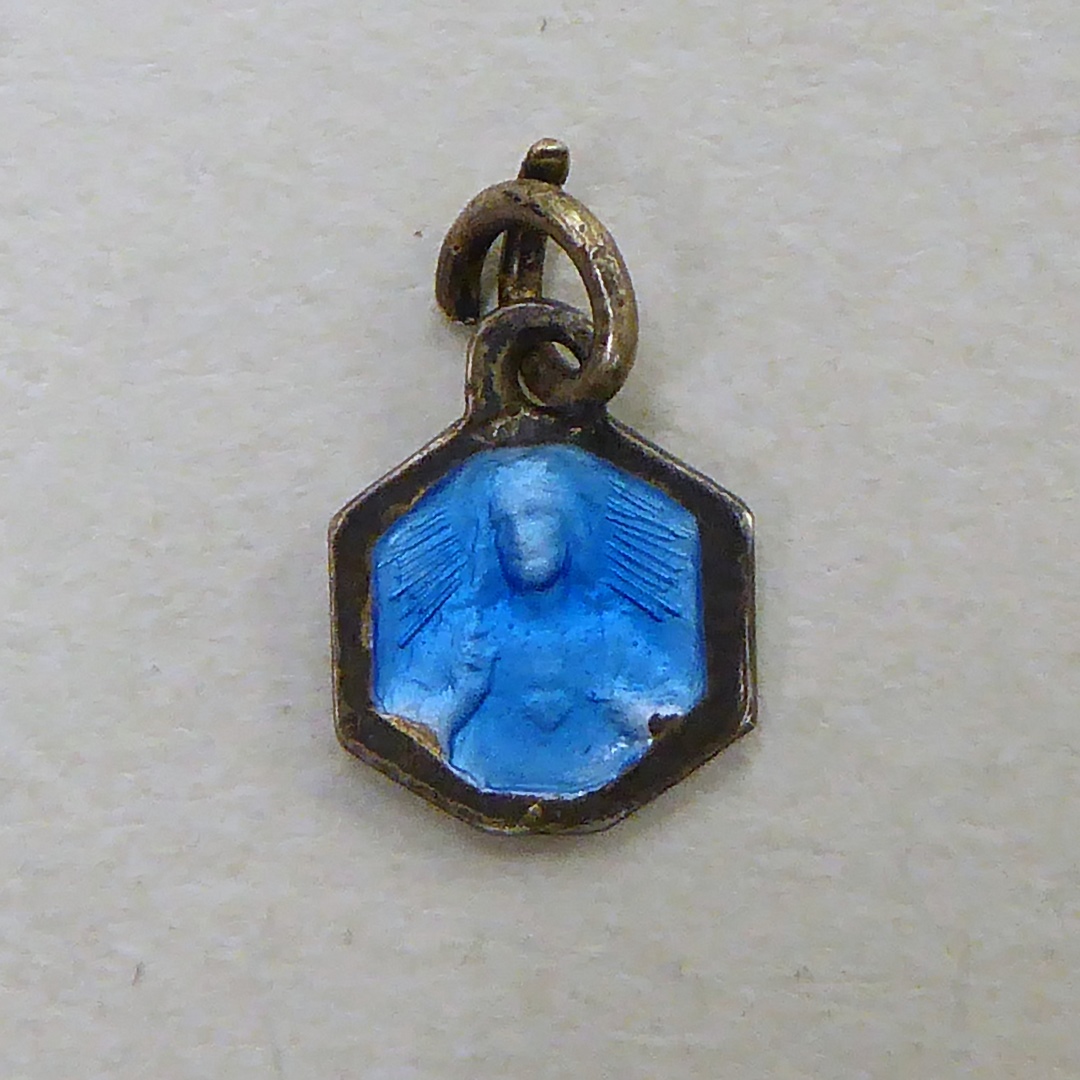 Blauwe achthoekige hanger met Maria met kind, kz. Christus met H. Hart