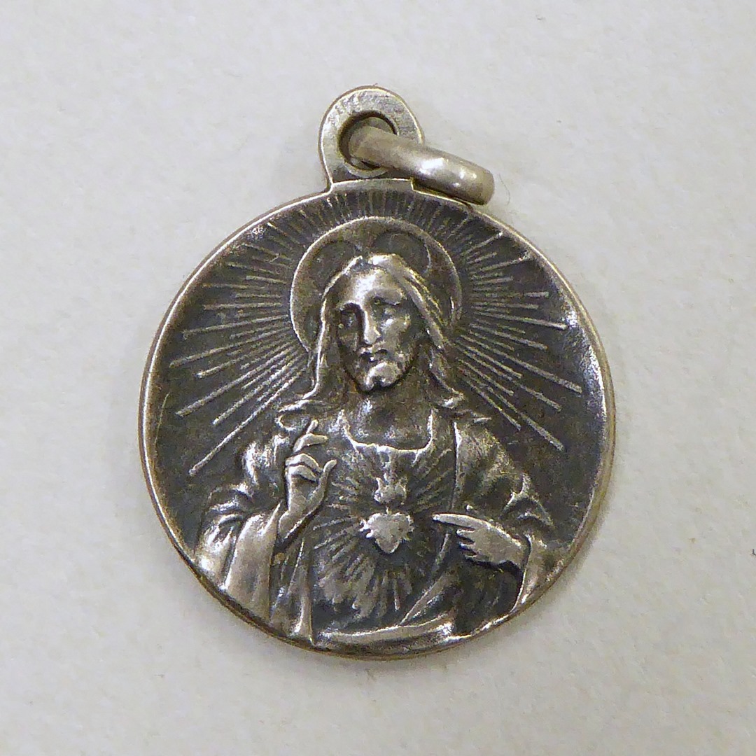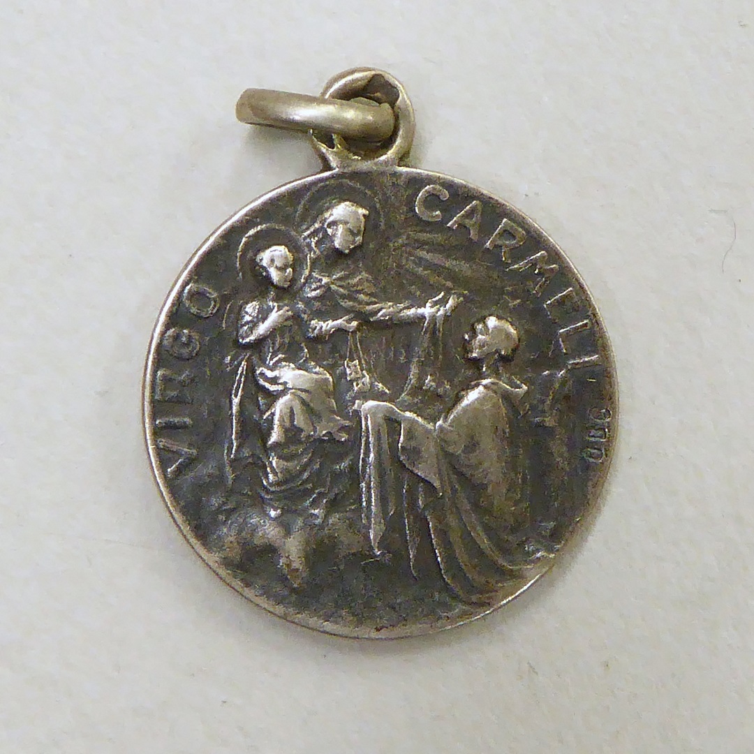 Scapuliermedaille met O.L. Vrouw van de berg Karmel en knielende H. Simon Stock, kz. Christus