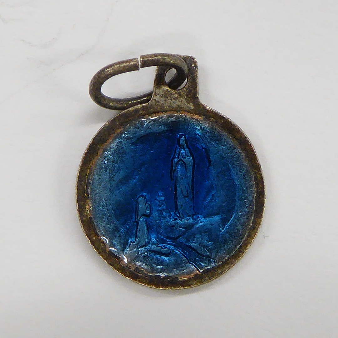 Draagpenning met portret en profil van Maria in blauw, kz. verschijning O.L. Vrouw van Lourdes