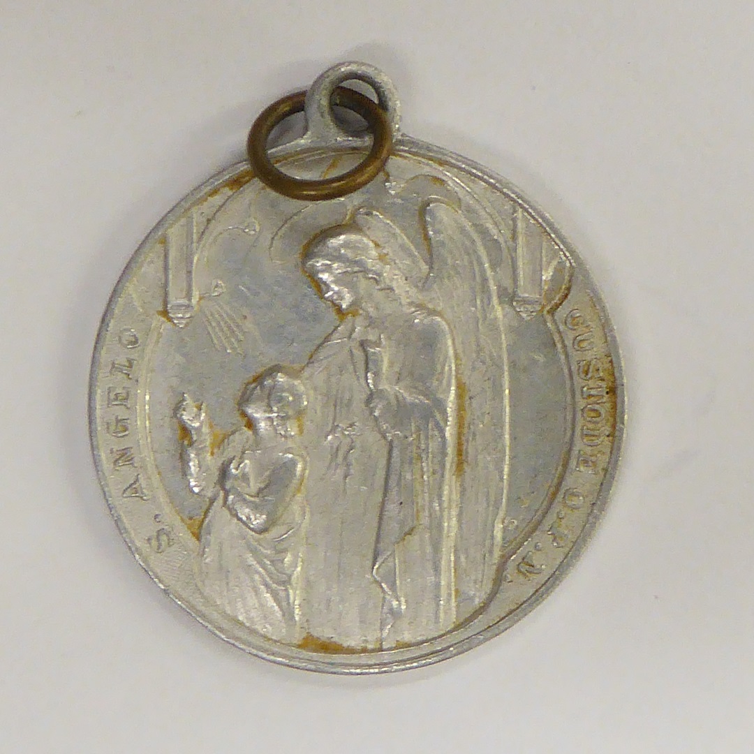 Draagpenning met H. Familie, kz. engelbewaarder met kind