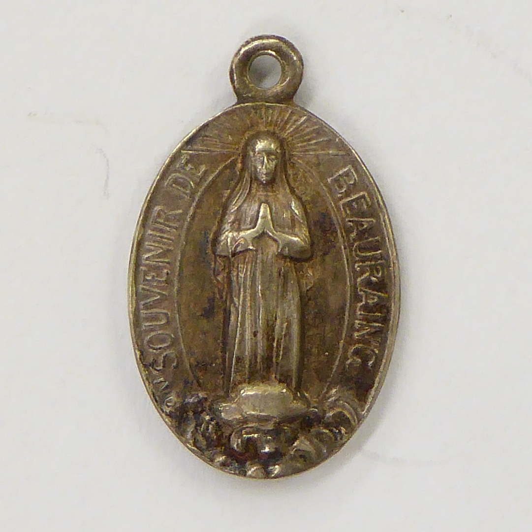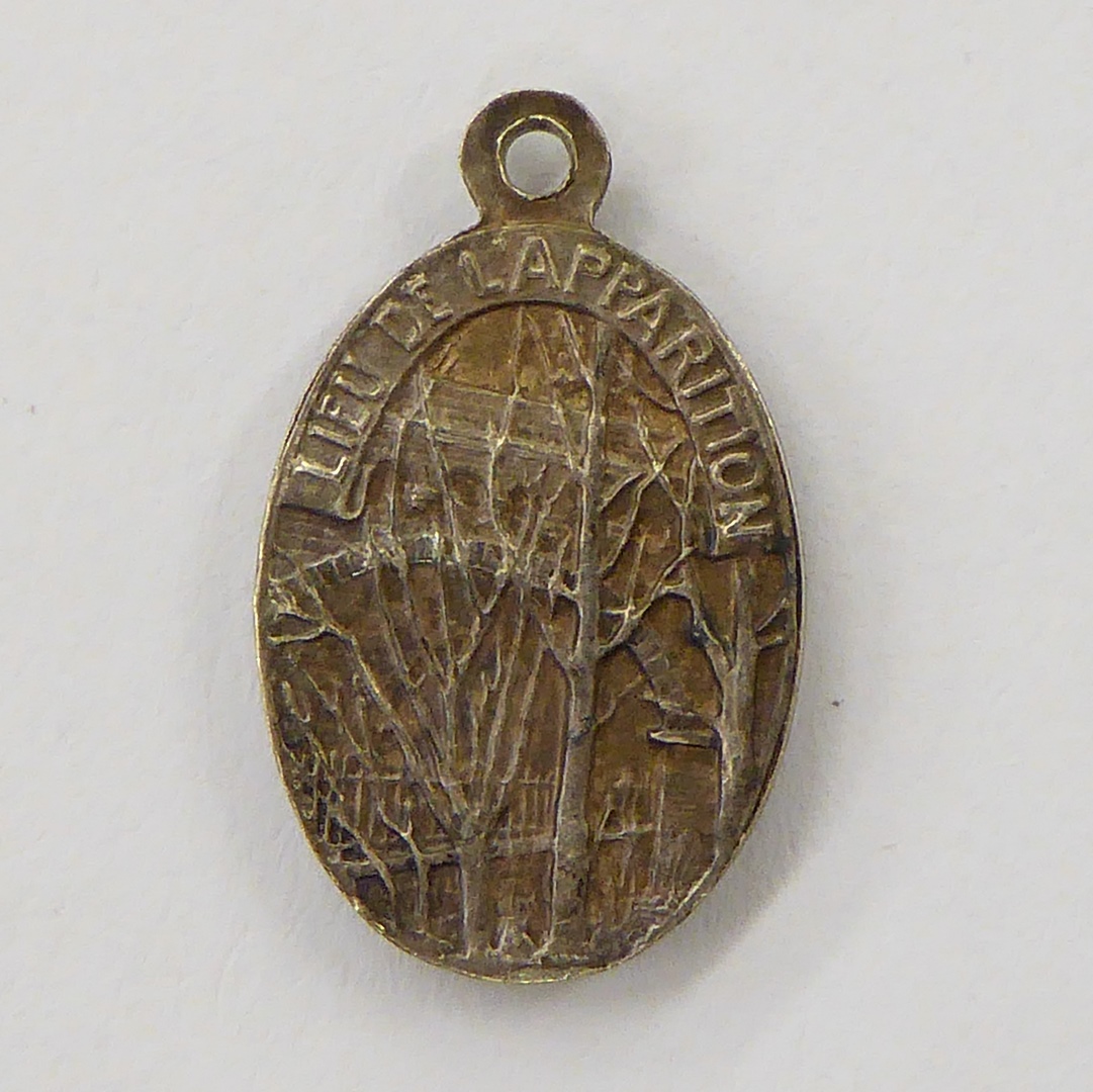 Bedevaartspenning met O.L. Vrouw van Beauraing, kz. spoorviaduct en bomen, plaats van verschijning