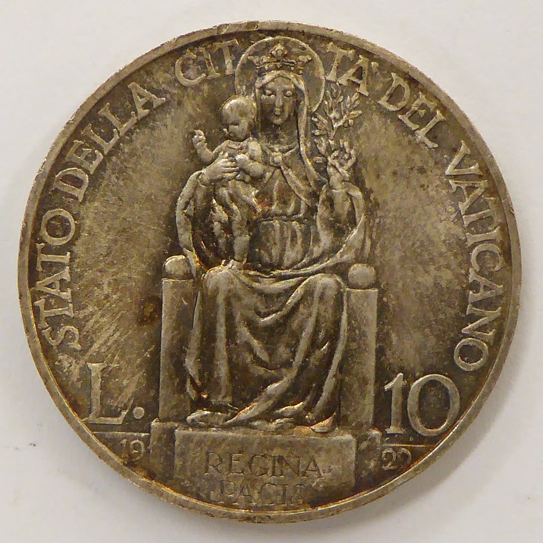 Tien lire met portret paus Pius XI (1922-1939), kz. tronende Maria met kind