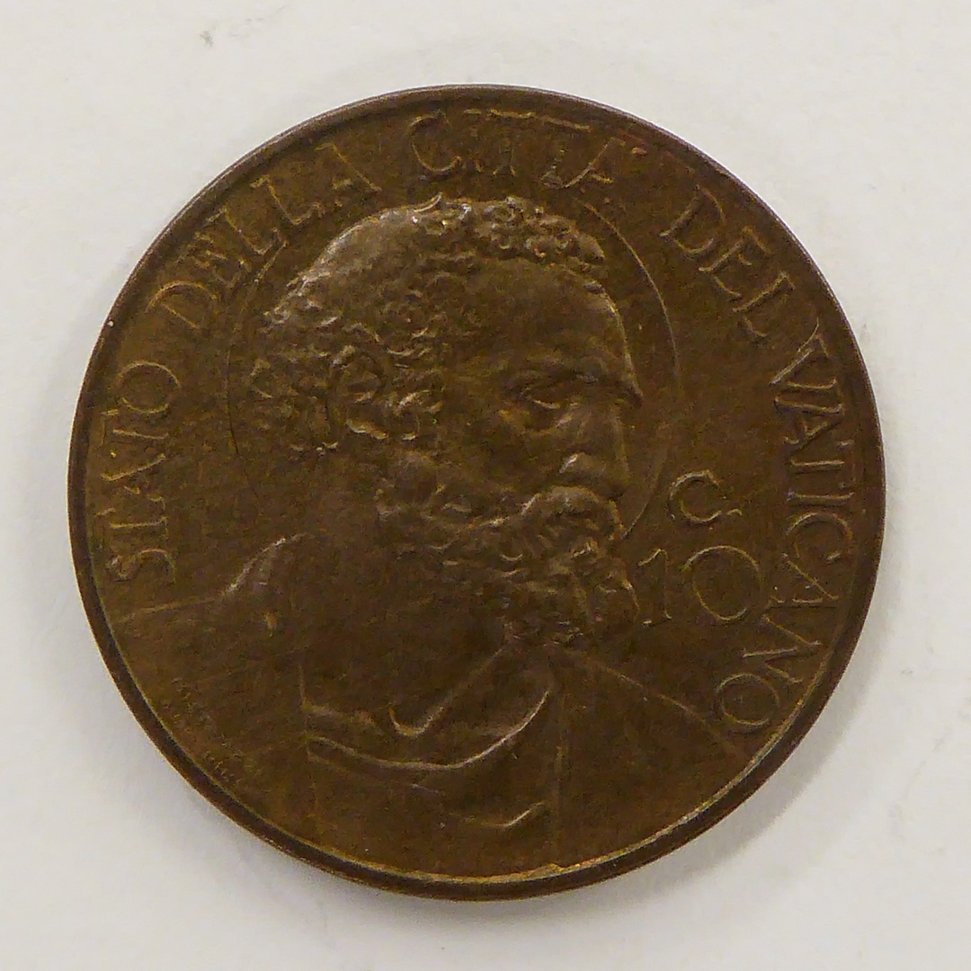 Tien centesimi paus Pius XI (1922-1939) met wapen, kz. buste H. Petrus