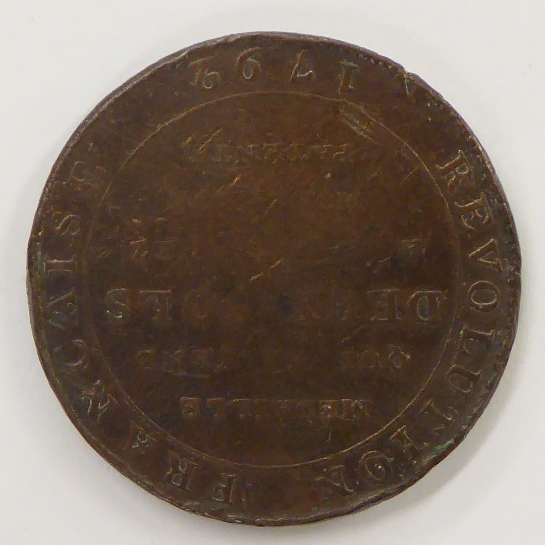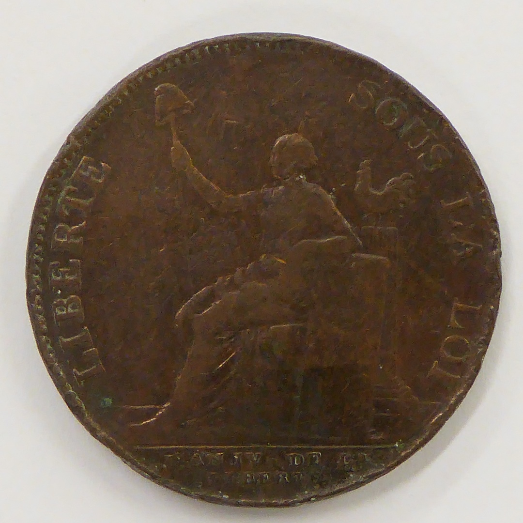 vz.: LIBERTE SOUS LA LOI afsnede: I. AN. IV. DE. LA. LIBERTE kz.: REVOLUTION FRANCAIS / MEDAILLE QUI SE VEND DEUX SOLS A PA (---) HEZ MON (---) ON PATENT