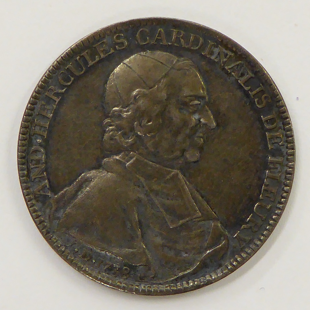 Gedenkpenning met portret kardinaal And. Hercules de Fleury, kz. wapen met hoed en engeltjes