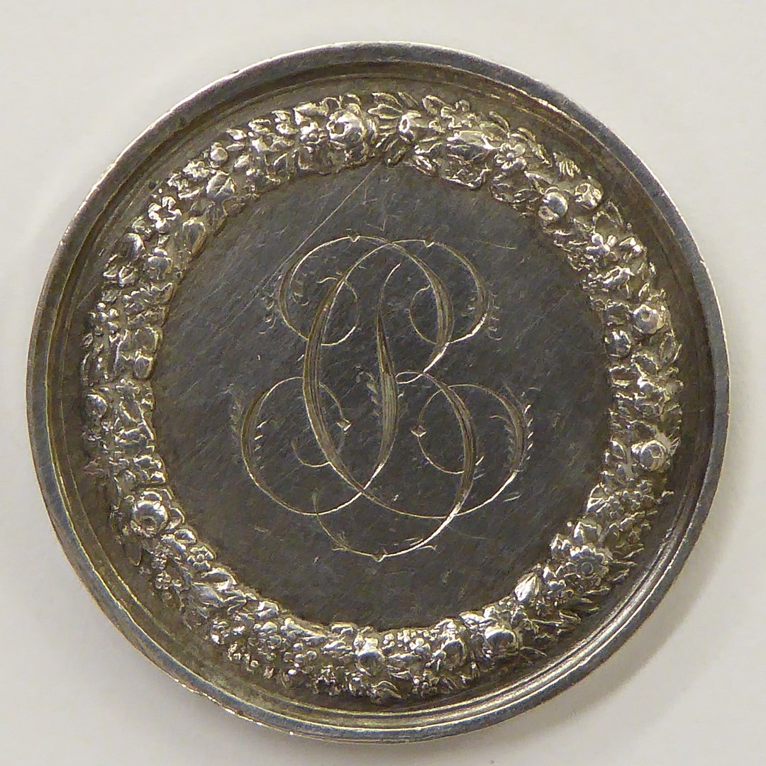 Huwelijkspenning met echtpaar en bisschop voor altaar, kz. met monogram "CB" binnen vruchtenkrans