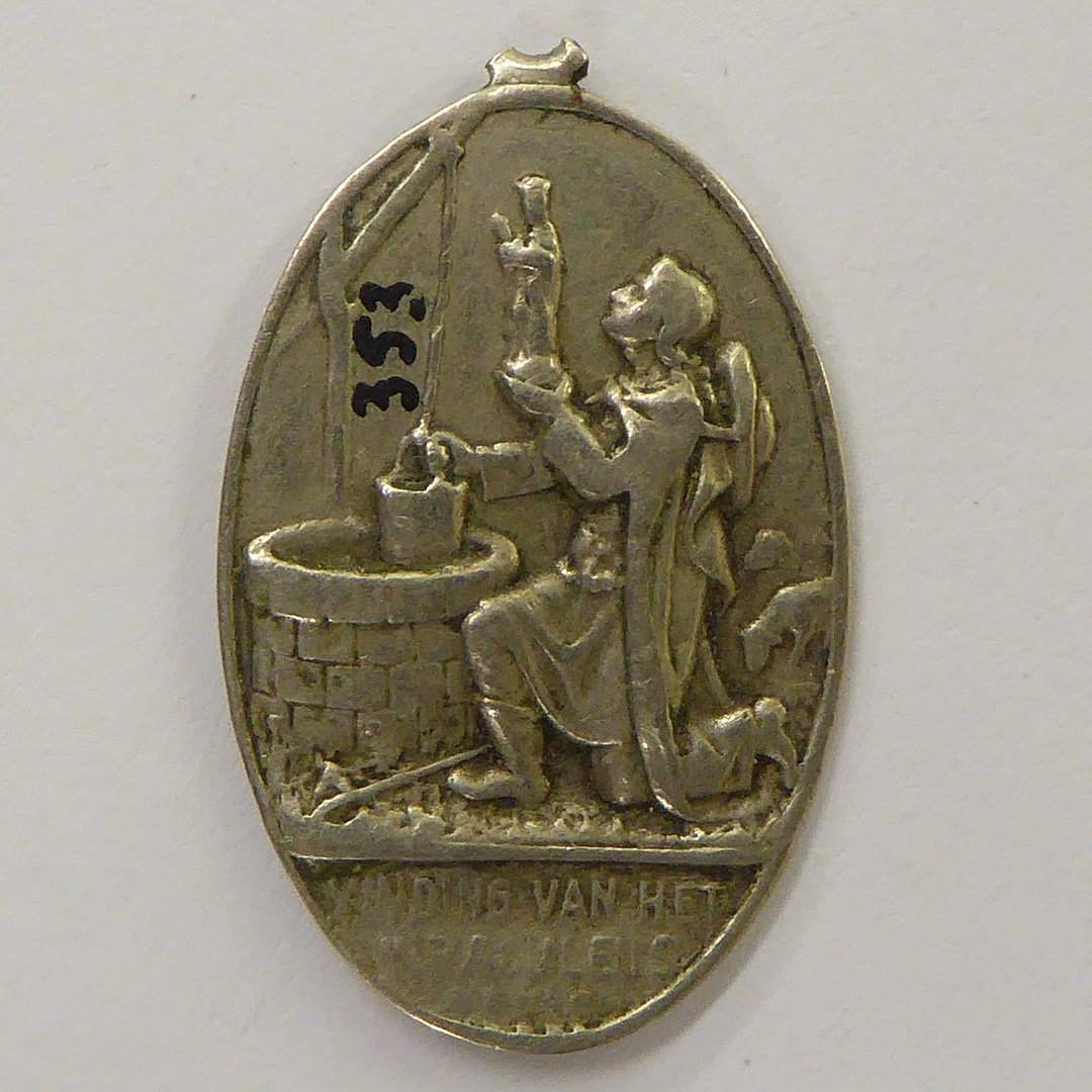 Bedevaartspenning met O.L. Vrouw in 't Zand (Roermond), kz. herder met beeldje bij put
