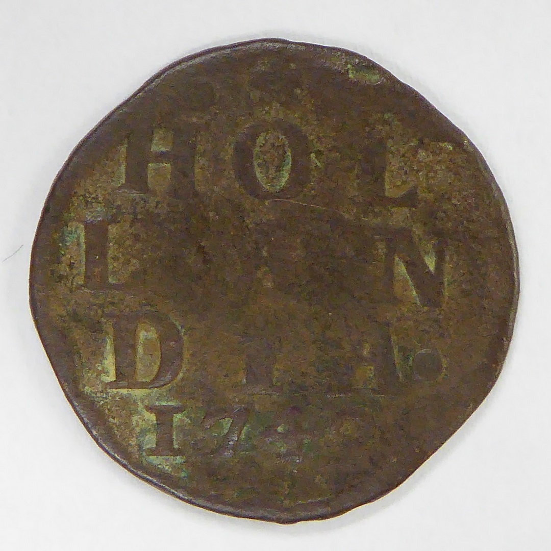 Duit Holland met leeuw in tuin met hek, kz. tekst
