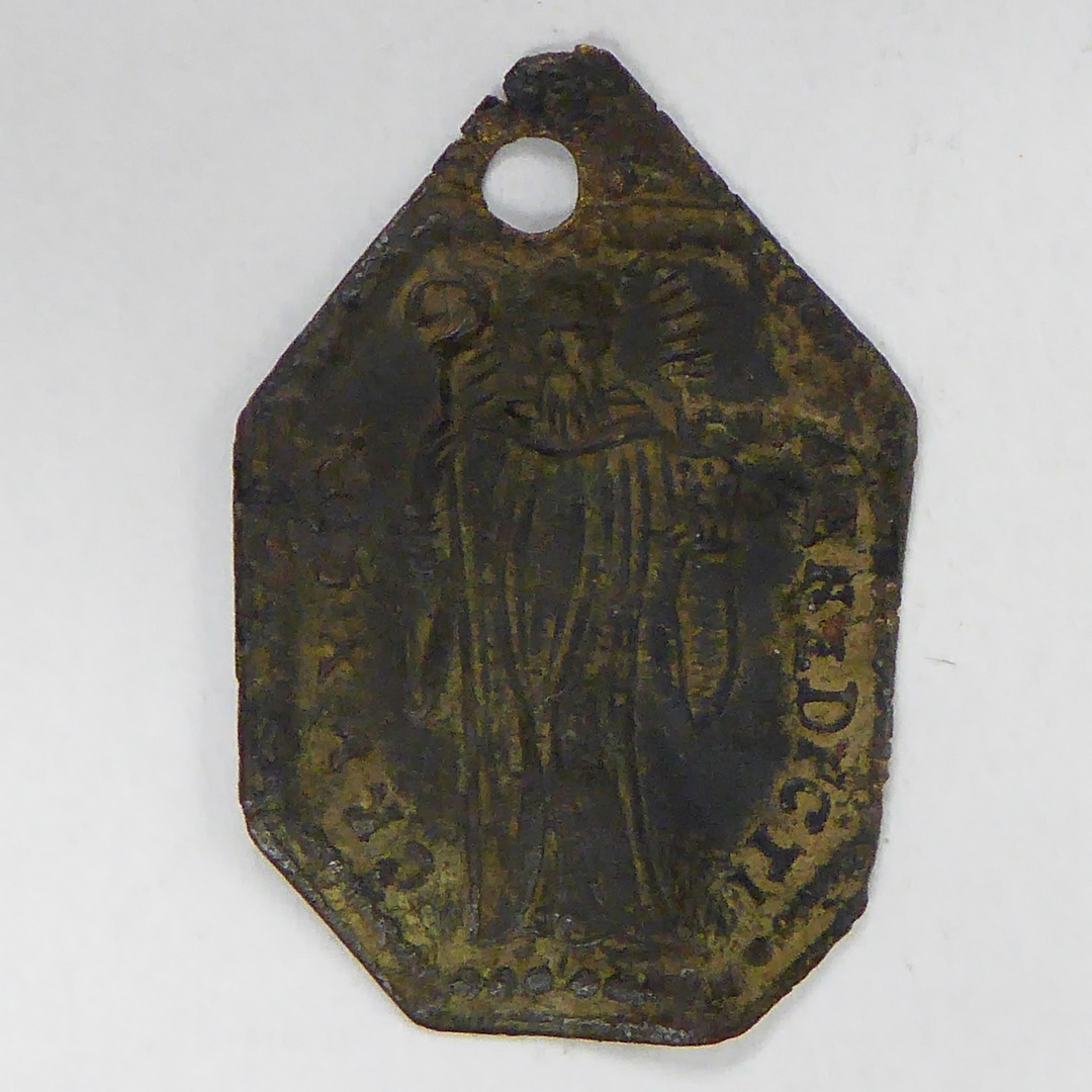 Benedictuspenning, achthoekig, met H. Benedictus, kz. Benedictuskruis