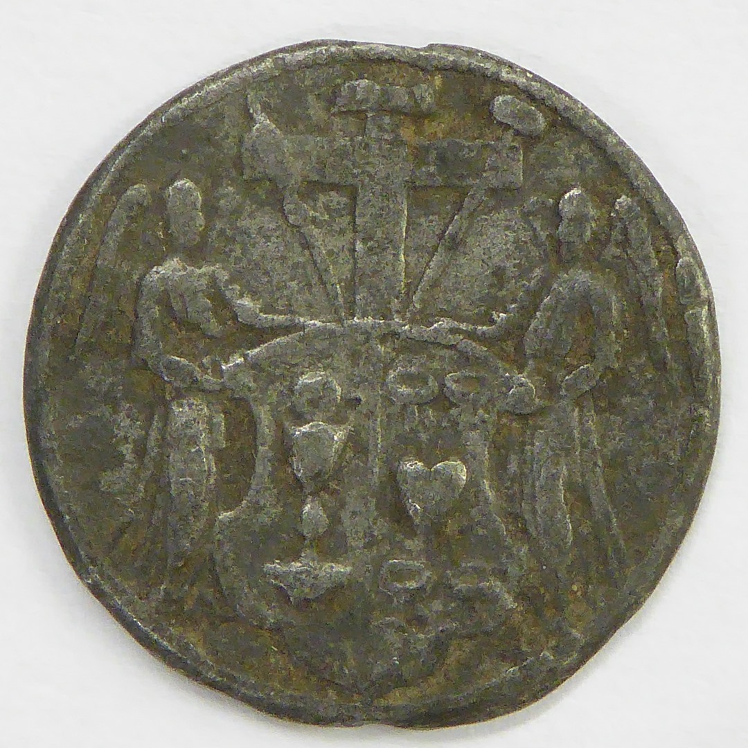 Penning met annunciatie, kz. lijdenssymbolen op wapenschild gehouden door engelen