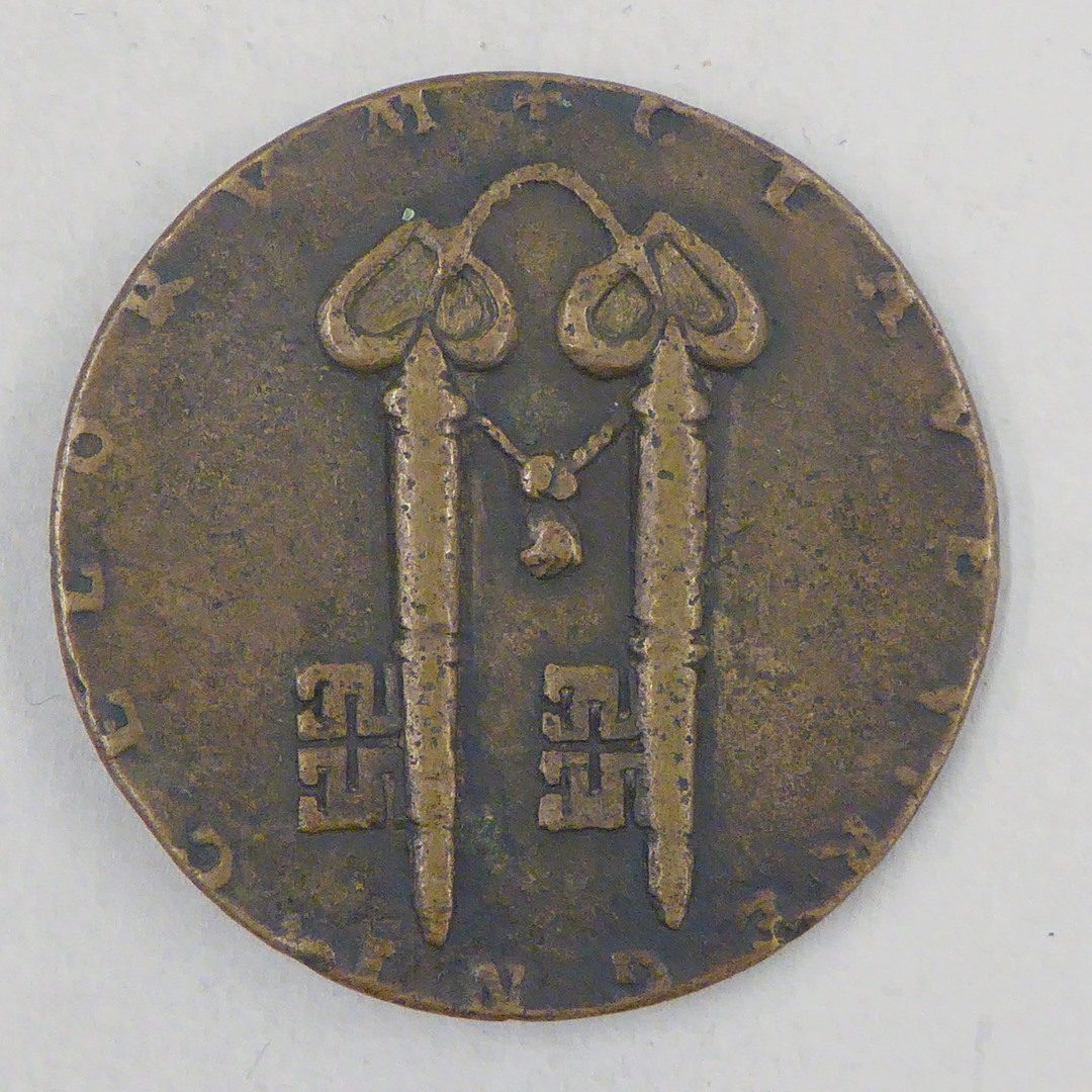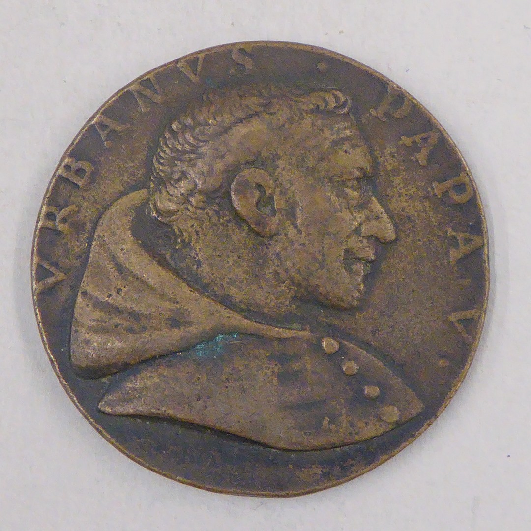 Pauspenning met portret paus Urbanus V (1362-1370), gegoten, kz. twee parallelle sleutels