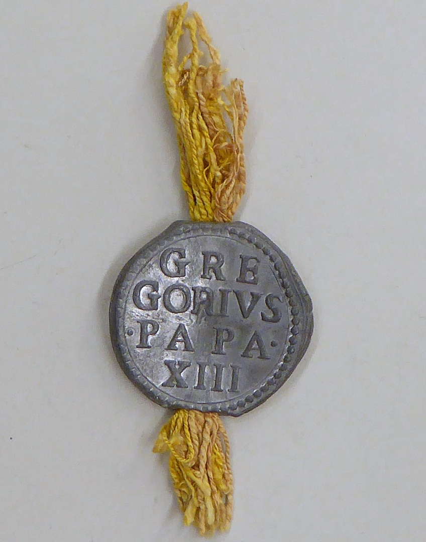Zegel van pauselijke bul paus Gregorius XIII met naam paus, kz. Petrus en Paulus