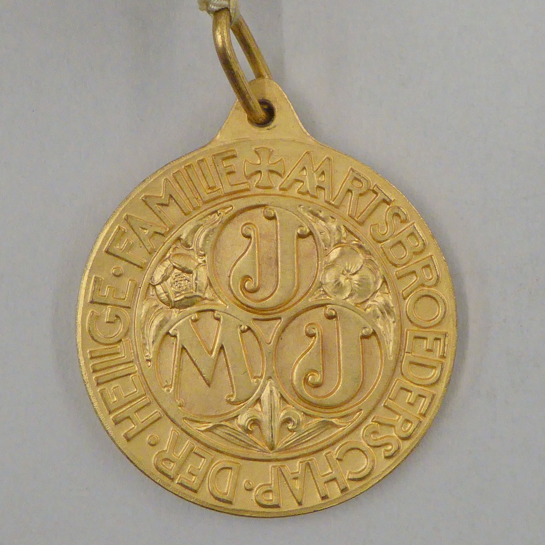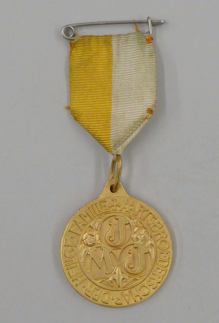 Goudkleurige jubileumpenning aan lint, 50-jarig lidmaatschap Aartsbroederschap der H. Familie
