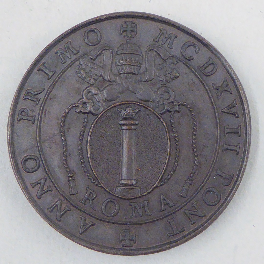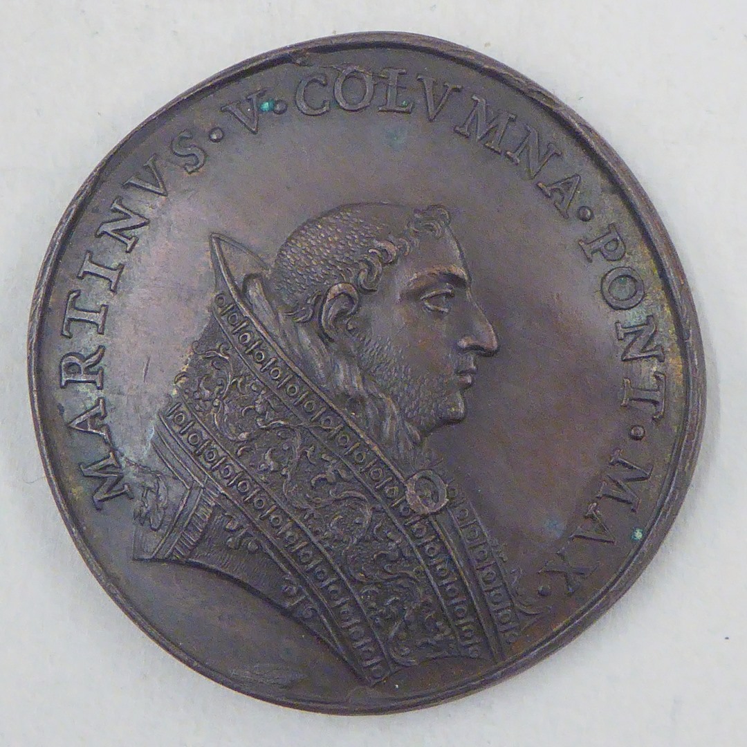 Pauspenning met portret paus Martinus V (1417-1421), kz. pauselijk wapen en "MCDXVII"