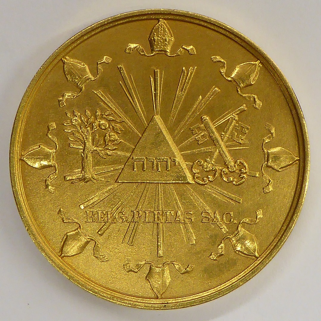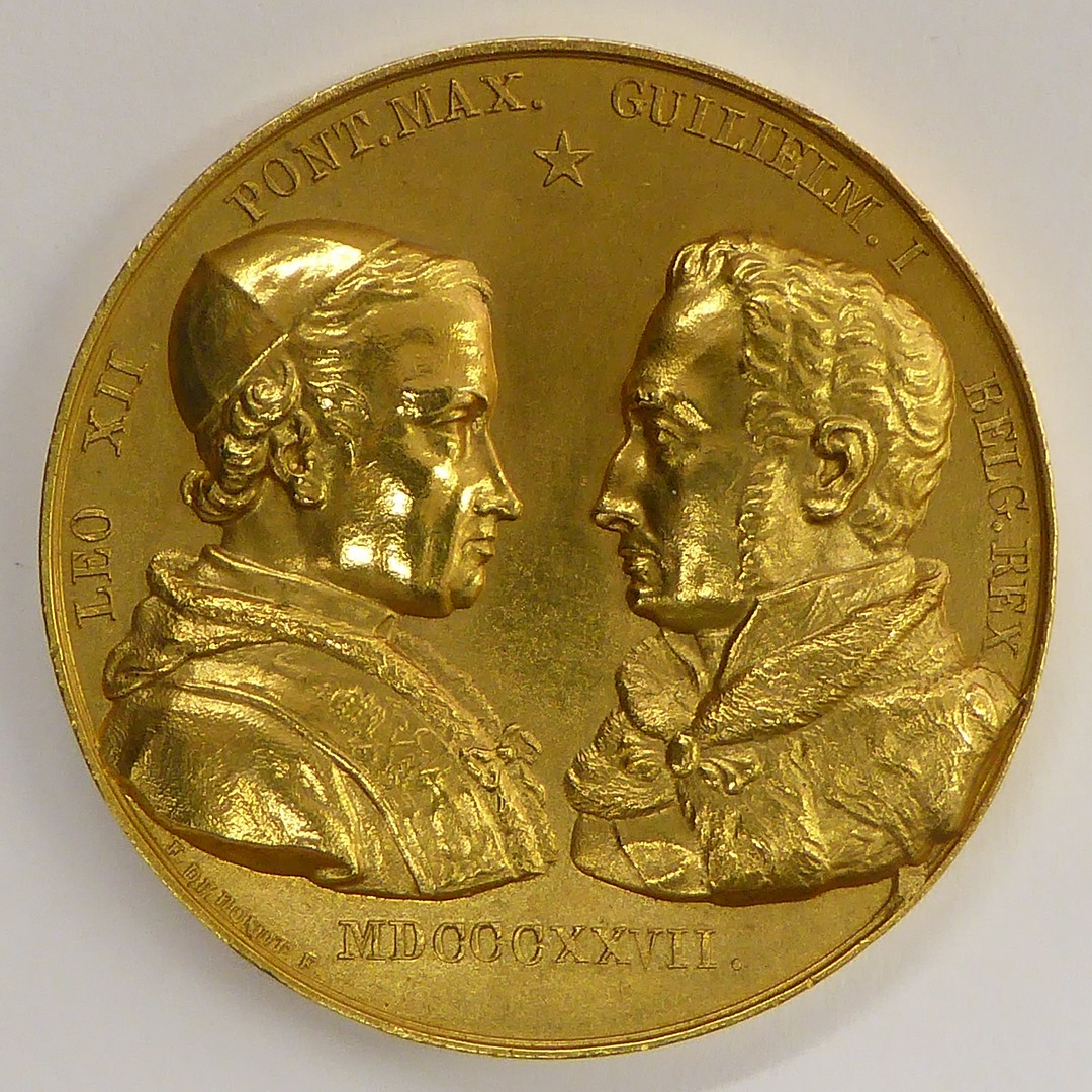 Pauspenning met portret paus Leo XII (1823-1829) en portret Koning Willem I, kz. driehoek met Hebreeuwse tekens, stralenbundels, oranjeboom, twee sleutels, mijters rondom
