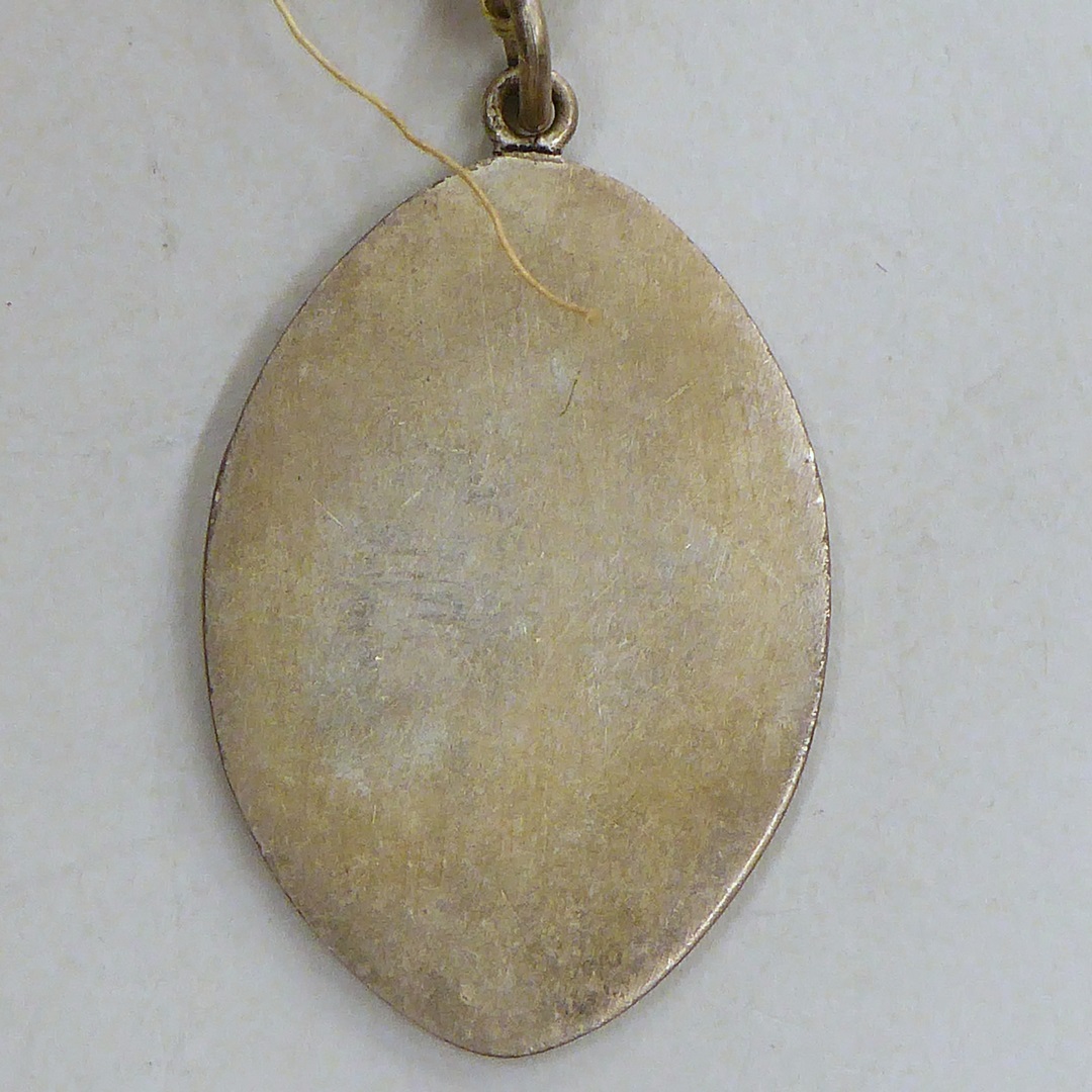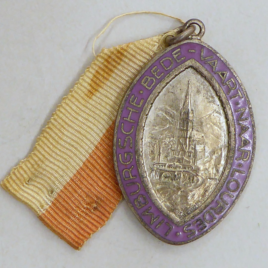 Deelnemerspenning Limburgsche Bedevaart naar Lourdes met kerk, aan rood-wit lint