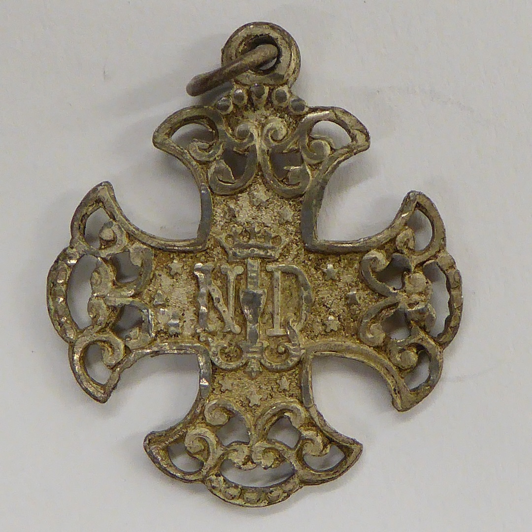 Hanger, kruisvormig, met O.L. Vrouw Onbevlekt Ontvangen, kz. met ND-monogram
