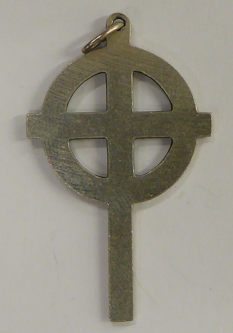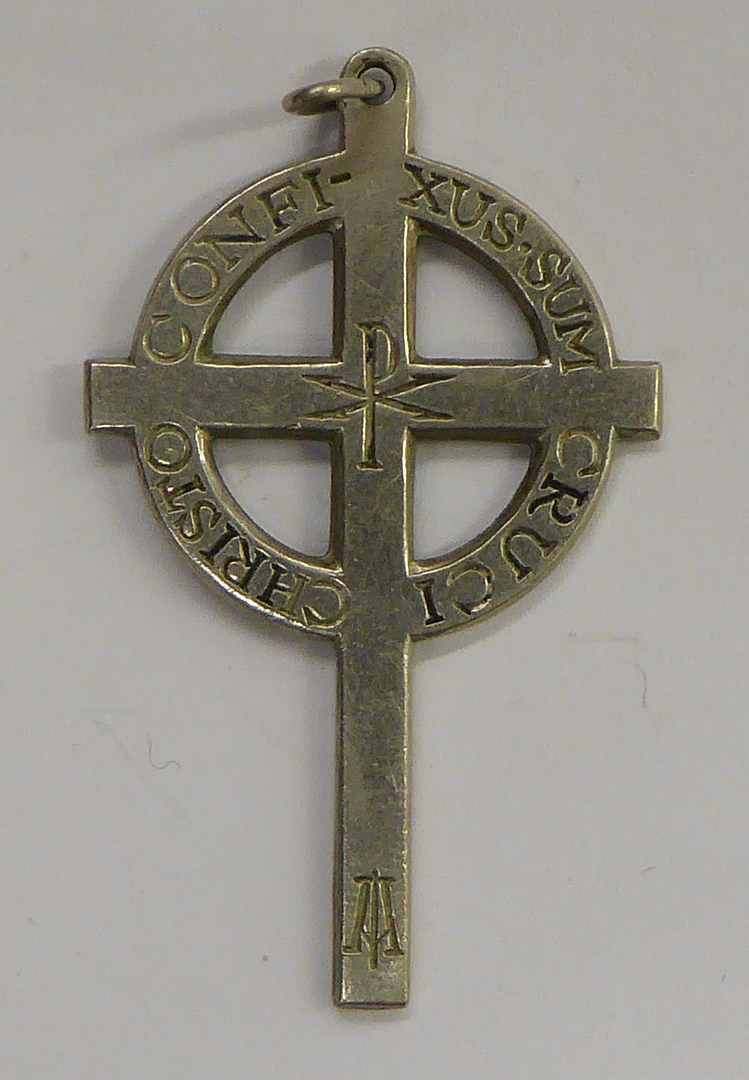 Hanger, kruis met cirkelband met "Confixus sum cruci Christo"