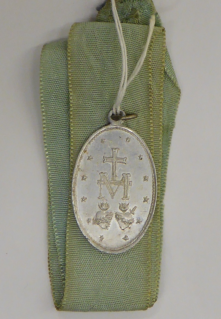 Lidmaatschapspenning Mariacongregatie met O.L.V. van de Wonderdadige Medaille, met lichtblauw lint