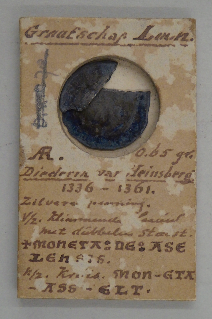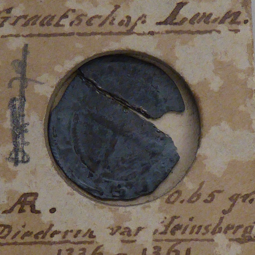 Munt Diederick van Heinsberg (1336-1361), halve klimmende leeuw met dubbele staart, kz. kruis