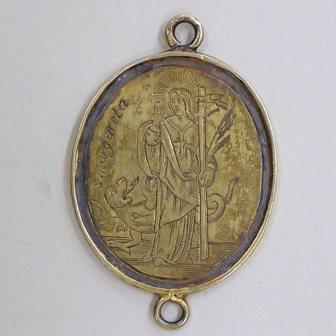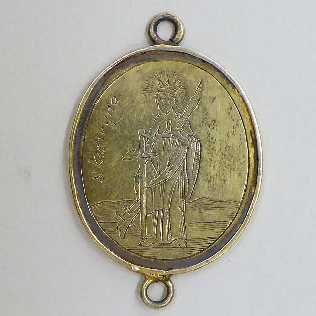 Draagpenning, ovaal, met H. Margaretha, kz. H. Catharina en "S. Kattrijna"