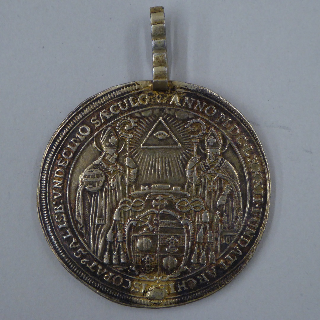Afgebeeld zijn de H.H. Martinus, Vincentius, Hermes, Chrysanthus en Daria. Aartsbisschop van Salzburg is Max Gandolf Graf von Kuenburg. vz.: SS. MARTINVS. EP. VINCENTIVS. M. HERMES. M. CHRYSANTHVS. ET. DARIA. M.M.// TRANSLATI. A. MAX. GAN. EX. COMIT. DE. KV(en)BVRG. ARCHIEP. & PR. SALISB. S. SED. AP. LI. kz.: ANNO. M.DC.LXXXII. FUNDATI. ARCHIEPISCOPAT(us). SALISB. VNDECIMO. SAECVLO.