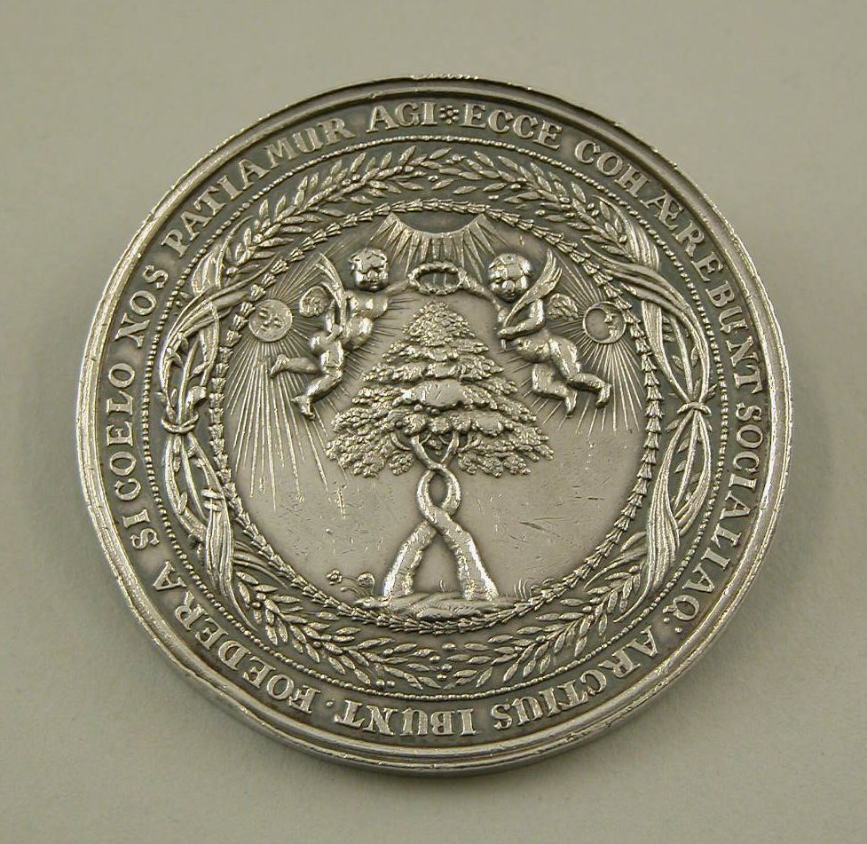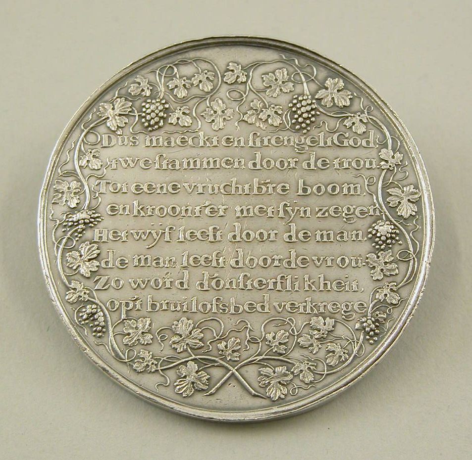 Huwelijkspenning met verstrengelde boomstammen "Ecce cohaerebunt ...", kz. "Dus ... strengelt God ..."