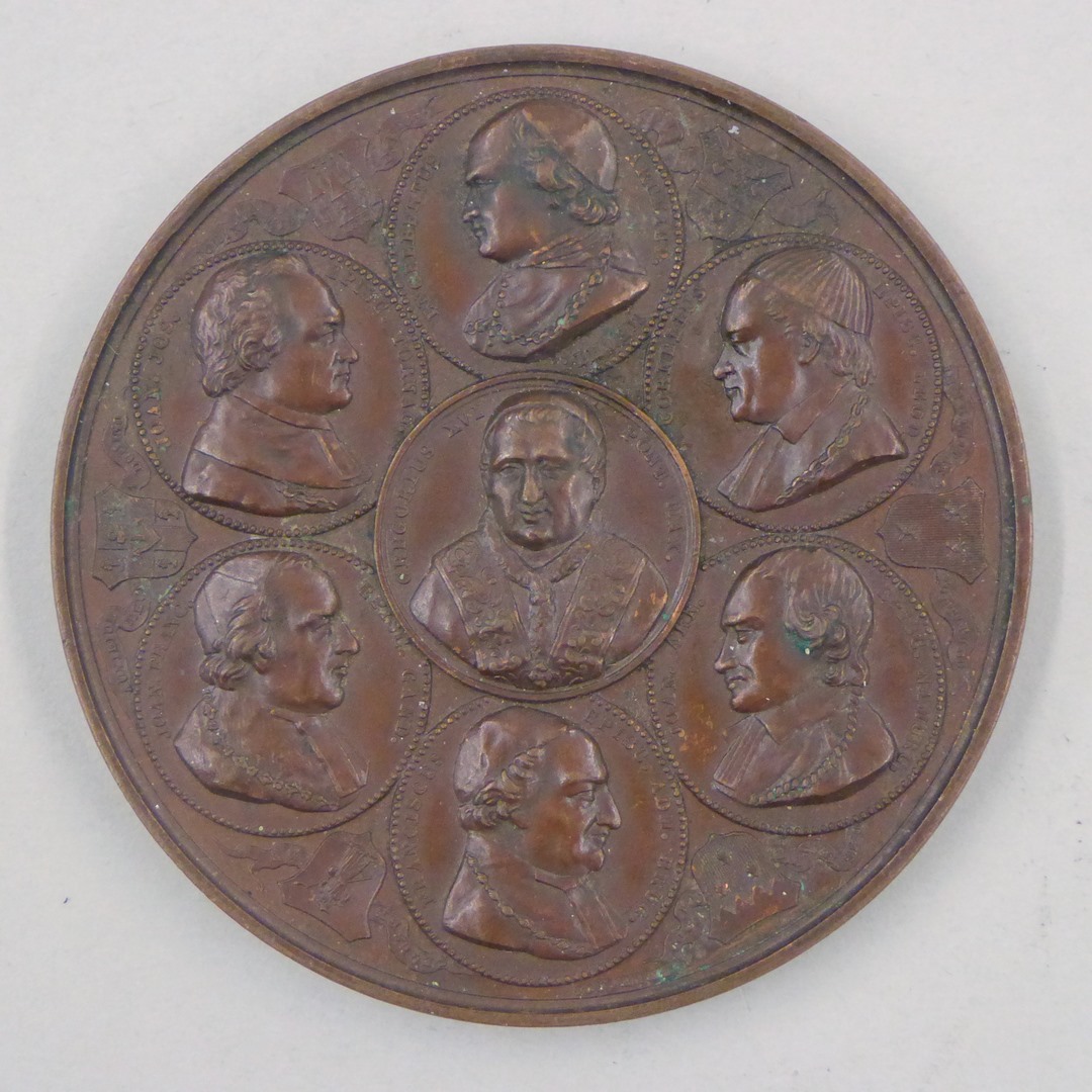 Gedenkpenning op de overbrenging van de Katholieke Universiteit van Mechelen naar Leuven, met portret Gregorius VI en zes (Belgische) bisschoppen, kz. tekst en portret rector Pierre François Xavier de Ram