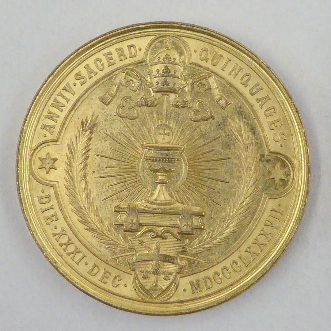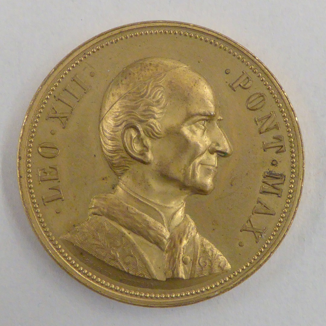 Pauspenning met portret paus Leo XIII (1878-1903), kz. kelk op boek, waardigheidstekens